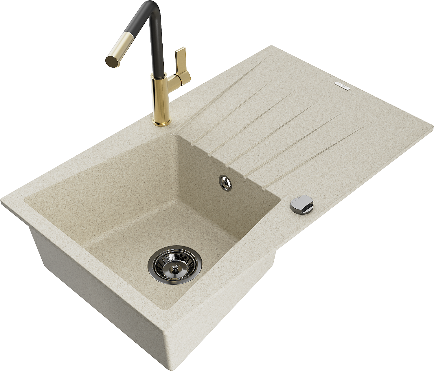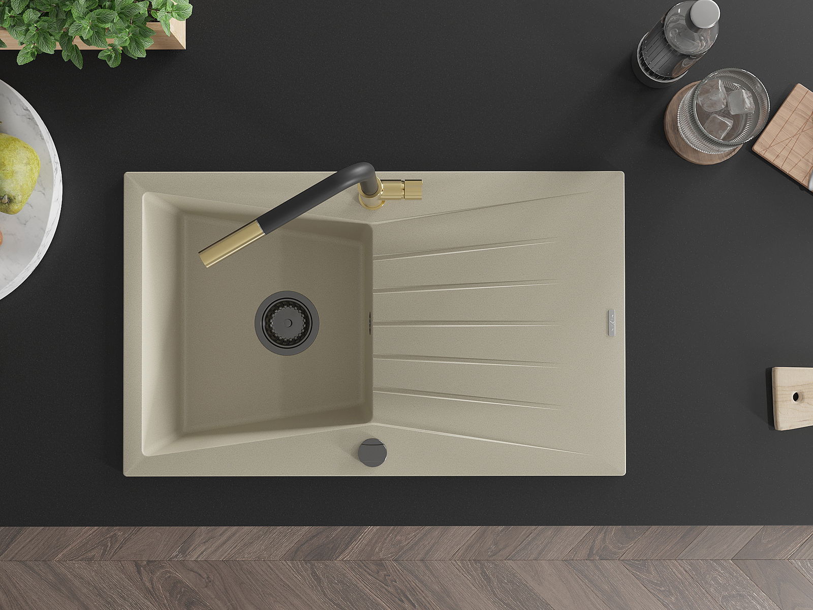 Mexen Cesar granitový dřez s 1 komorou a odkapávačem a kuchyňskou baterií Flora, béžový - 6514-69-670401-57-B