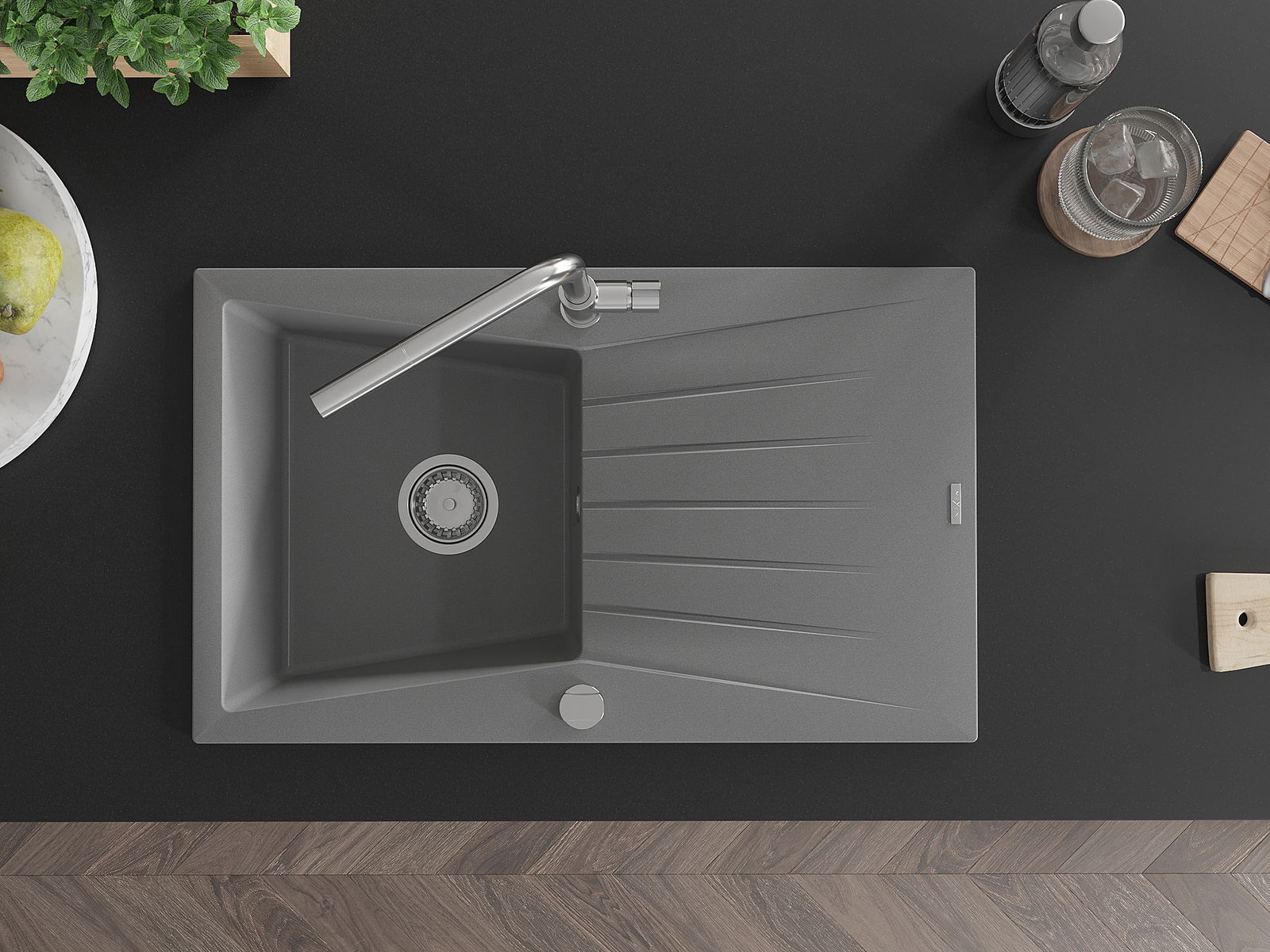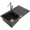 Mexen Cesar granitový dřez s jednou komorou, odkapávačem a kuchyňskou baterií Flora, šedý - 6514-71-670401-00