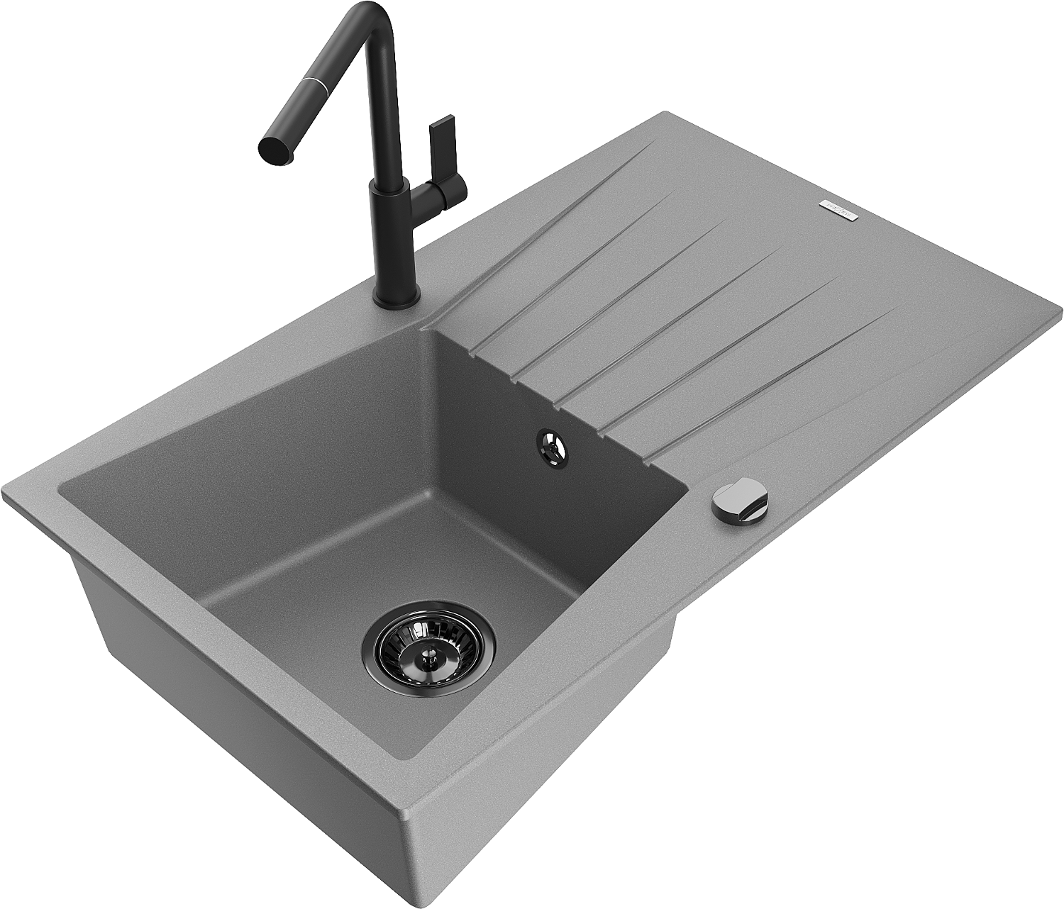 • Mexen Cesar jednokomorový granitový dřez s odkapávačem a kuchyňskou baterií Flora, šedý - 6514-71-670401-70-B