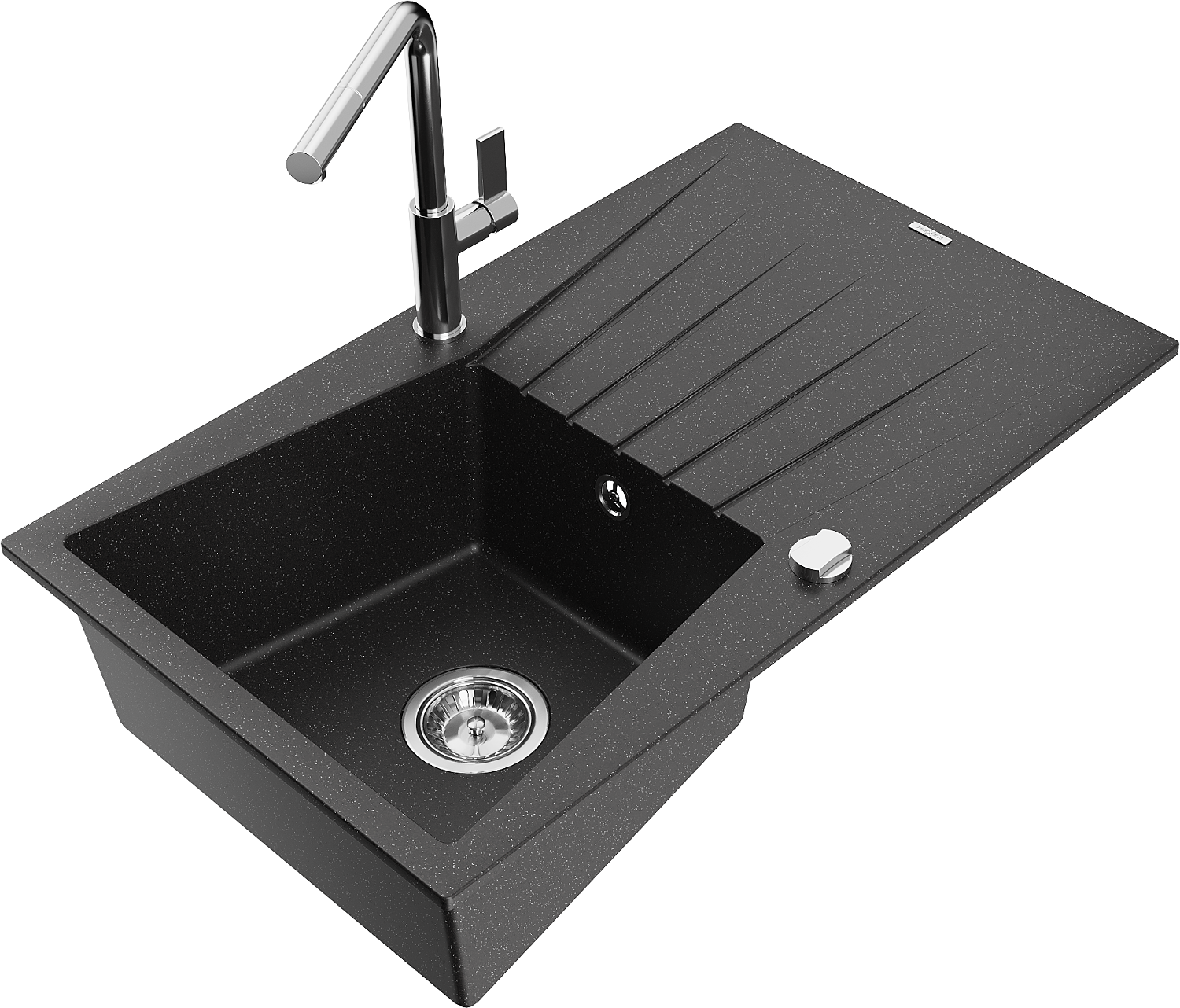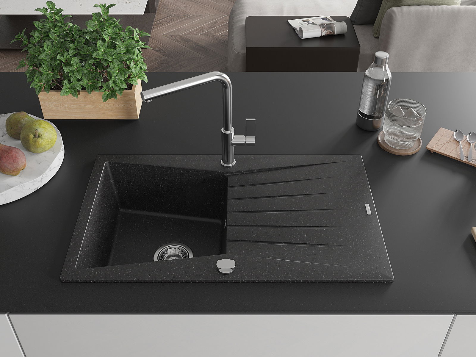 Mexen Cesar granitový dřez 1-komorový s odkapávačem a kuchyňskou baterií Flora, černý/stříbrný metalik - 6514-73-670401-00