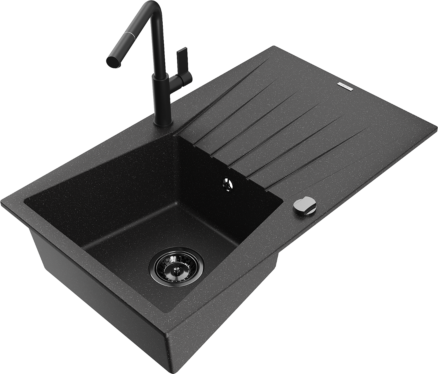 Mexen Cesar granitový dřez 1-komorový s odkapávačem a kuchyňskou baterií Flora, černý/stříbrný metalik - 6514-73-670401-70-B
