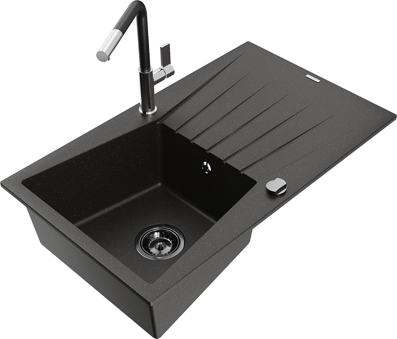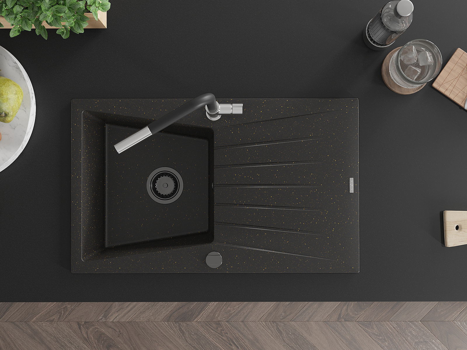 Mexen Cesar granitový dřez 1-komorový s odkapávačem a kuchyňskou baterií Flora, černý/zlatý metalik - 6514-75-670401-07-B