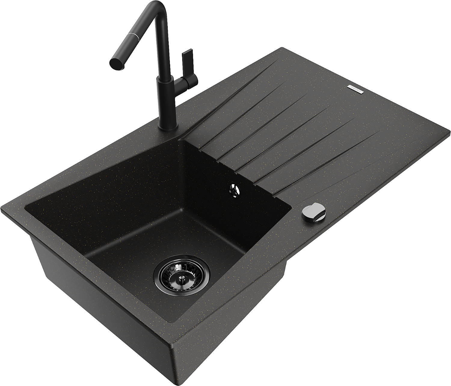 Mexen Cesar granitový dřez 1-oddílový s odkapávačem a kuchyňskou baterií Flora, černý/zlatý metalický - 6514-75-670401-70-B