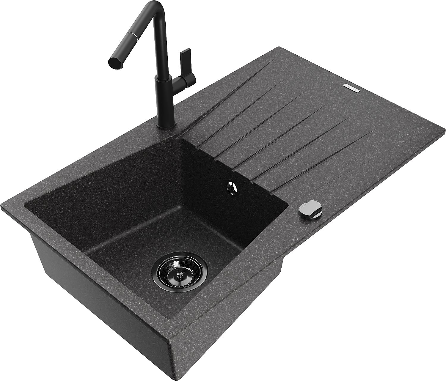 Mexen Cesar granitový jednodřez s odkapávačem a kuchyňskou baterií Flora, černý skvrnitý - 6514-76-670401-70-B