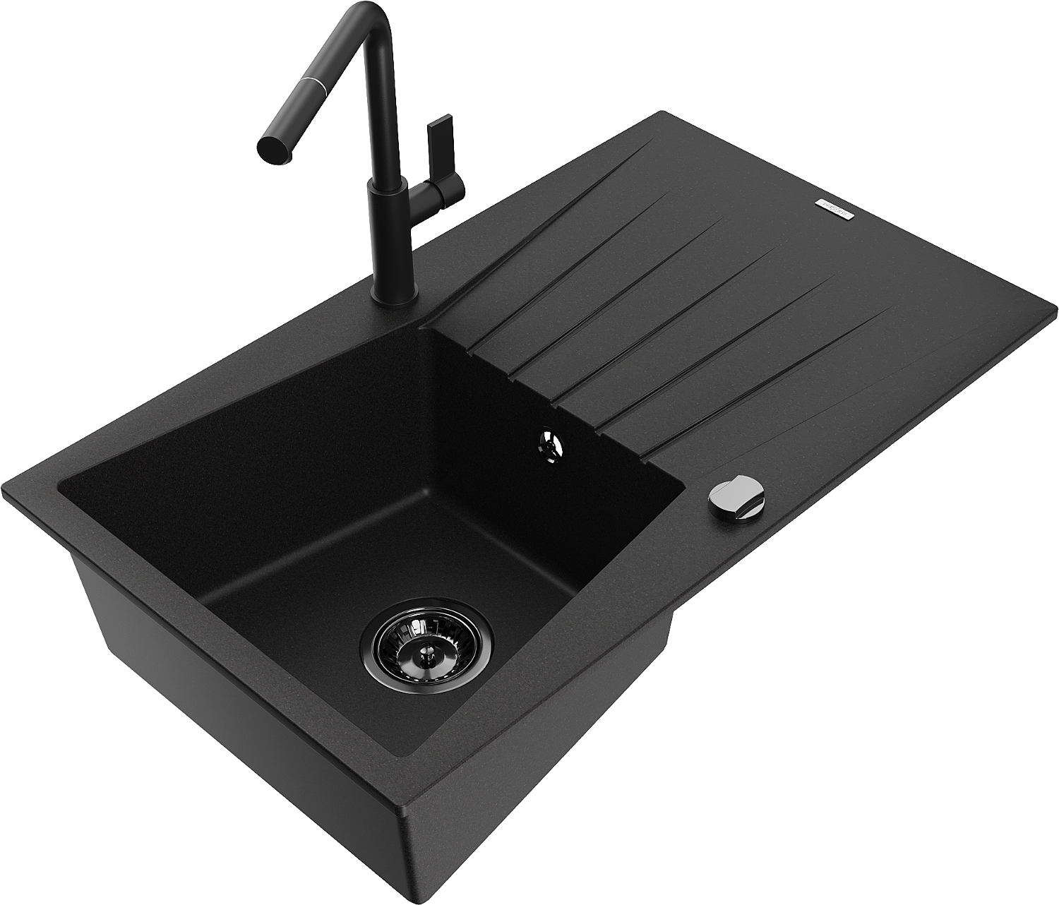 Mexen Cesar žulový dřez 1-komorový s odkapávačem a kuchyňskou baterií Flora, černý - 6514-77-670401-70-B