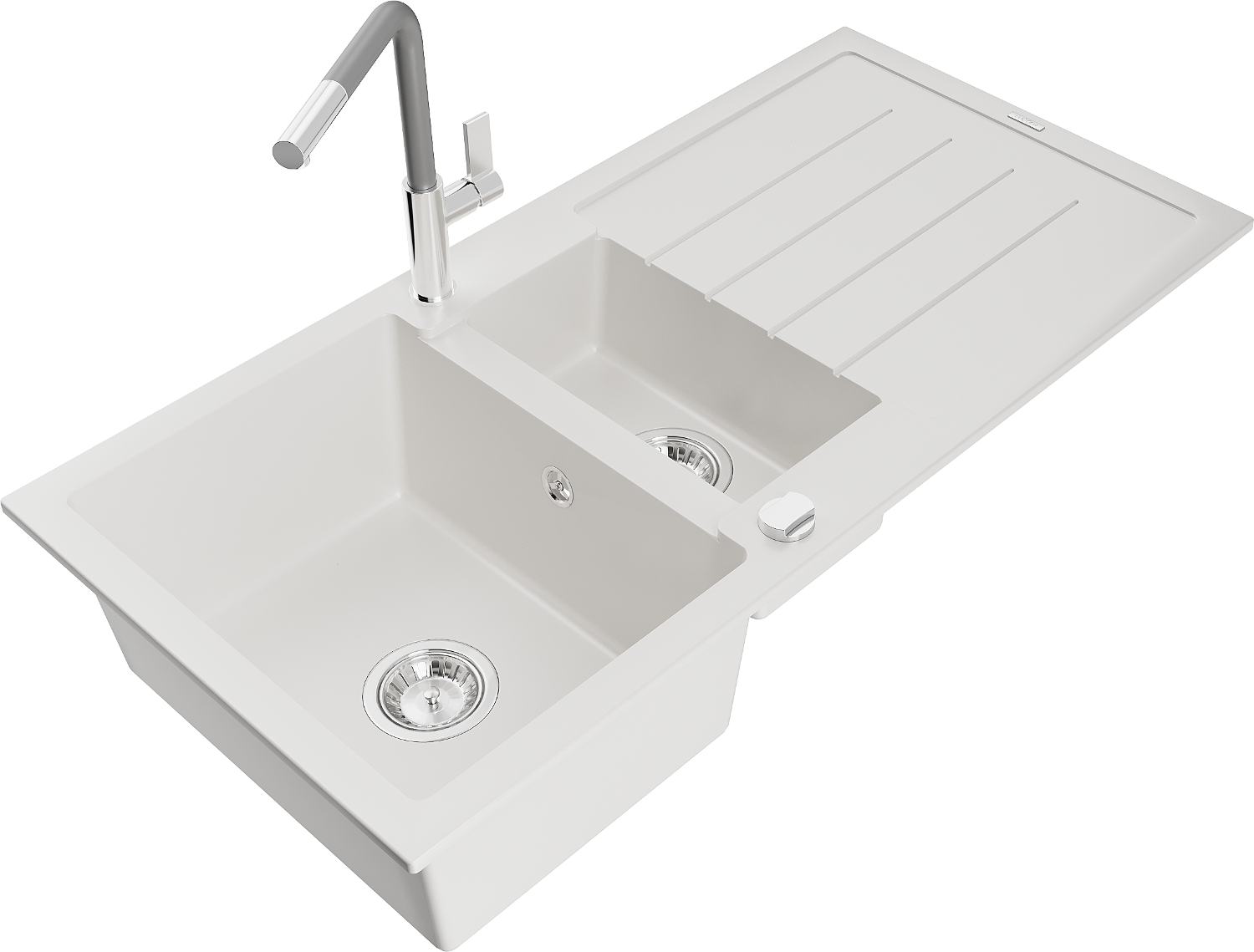 Mexen Andres granitový dřez 1,5-komorový s odkapávačem a kuchyňskou baterií Flora, bílý - 6515-20-670401-06