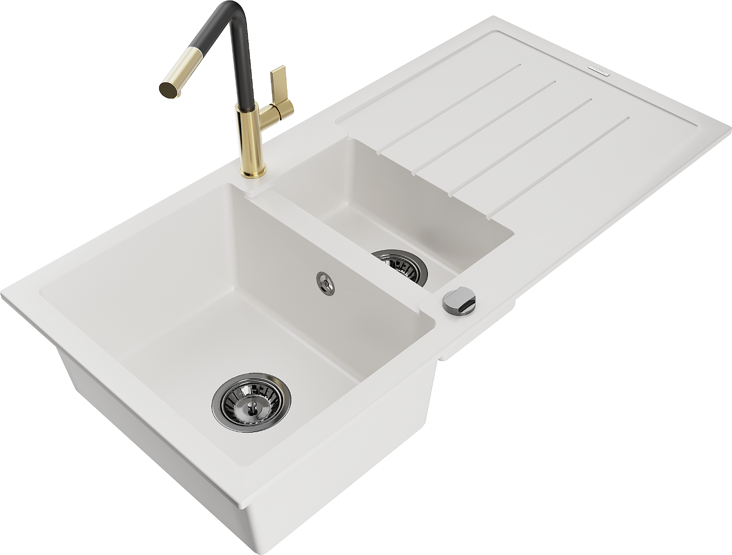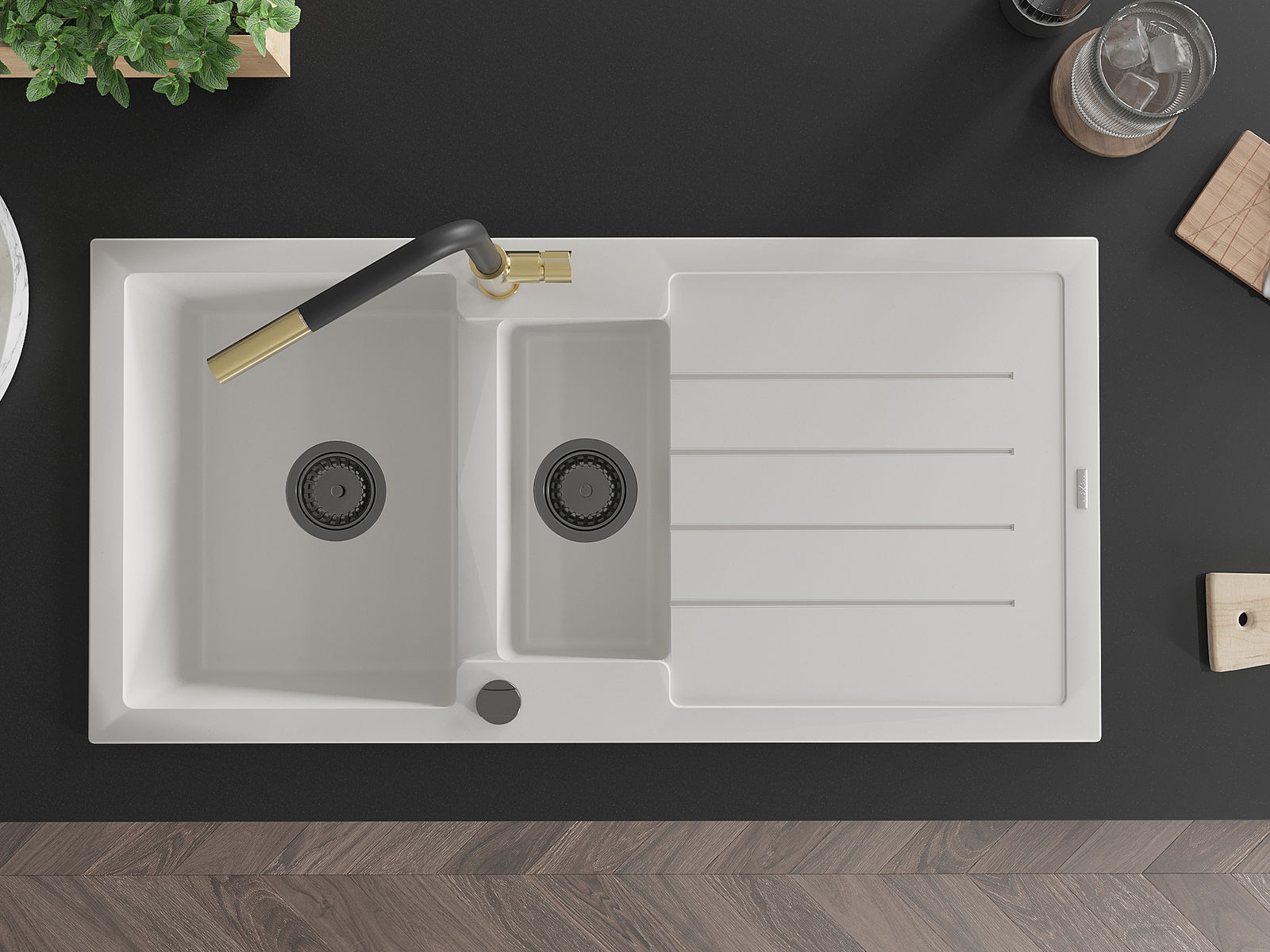 Mexen Andres granitový dřez 1,5-komorový s odkapávačem a kuchyňskou baterií Flora, bílý - 6515-20-670401-57-B