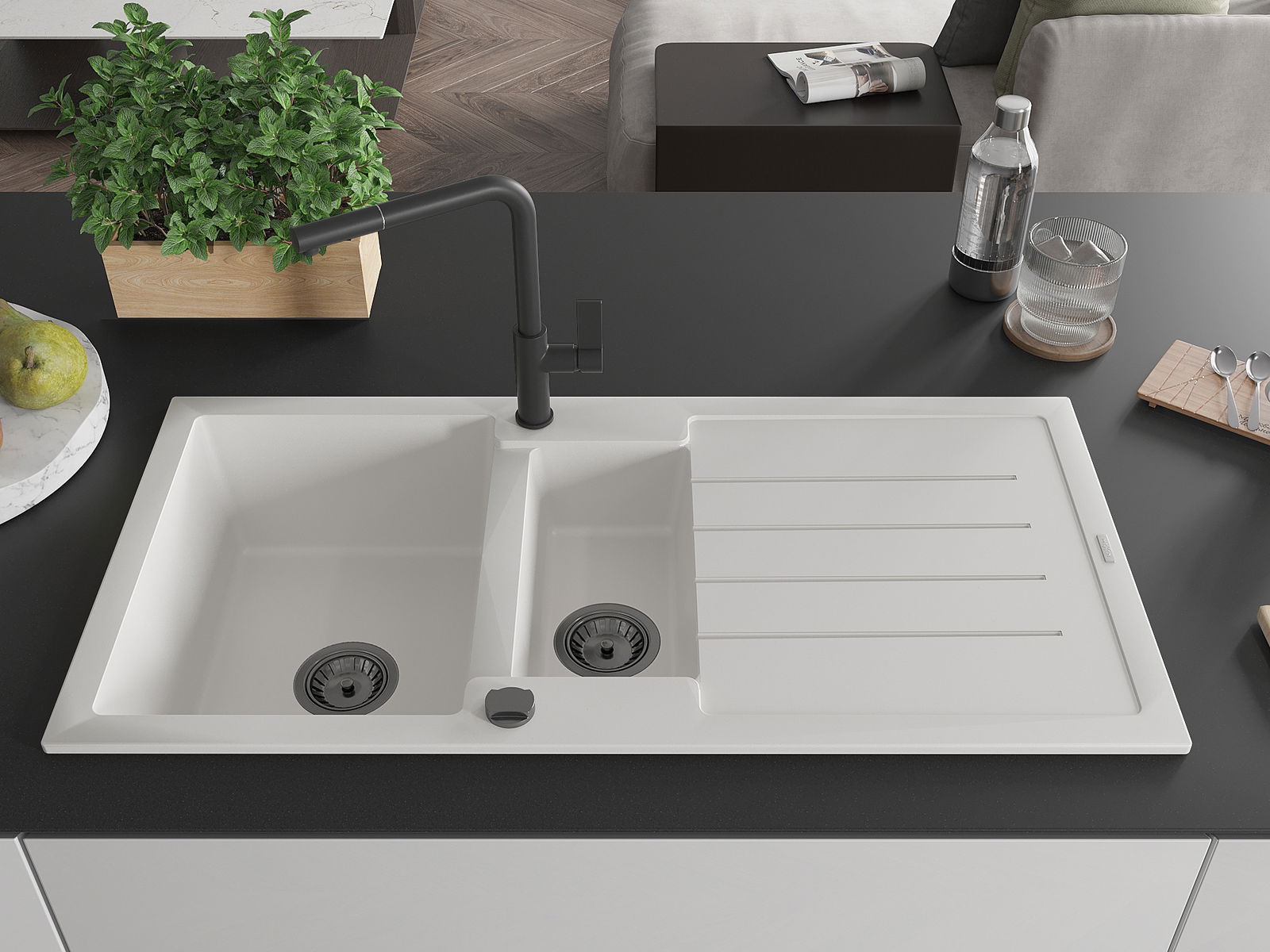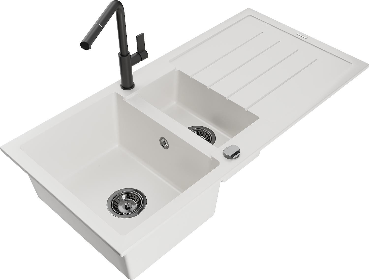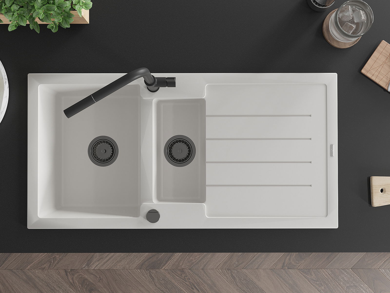 Mexen Andres granitový dřez 1,5-komorový s odkapávačem a kuchyňskou baterií Flora, bílý - 6515-20-670401-70-B