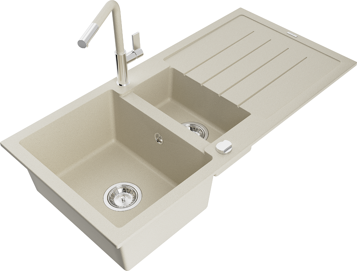 Mexen Andres granitový dřez 1,5-komorový s odkapávačem a kuchyňskou baterií Flora, béžový - 6515-69-670401-09