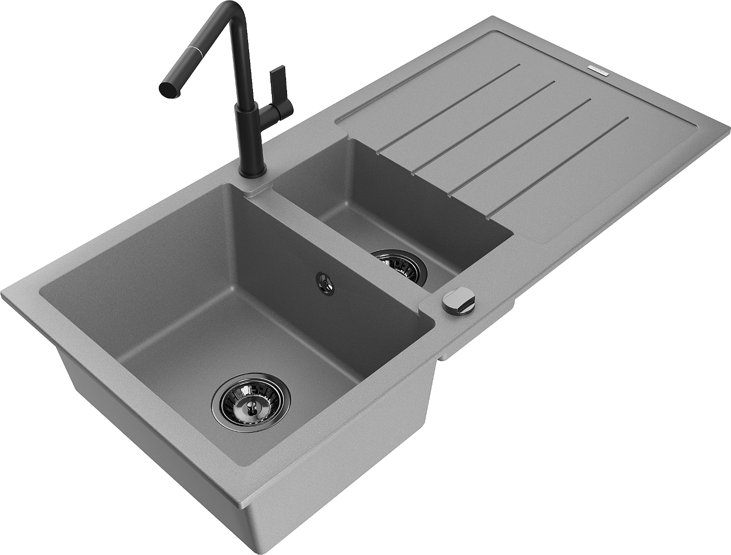 Mexen Andres granitový dřez 1,5-komorový s odkapávačem a kuchyňskou baterií Flora, šedý - 6515-71-670401-70-B