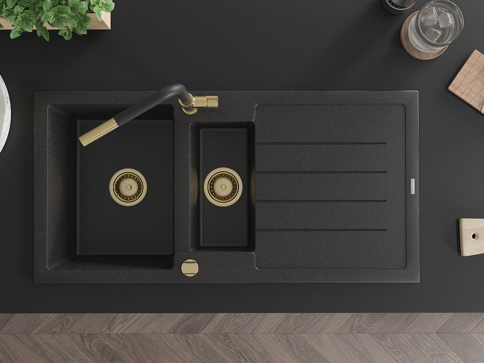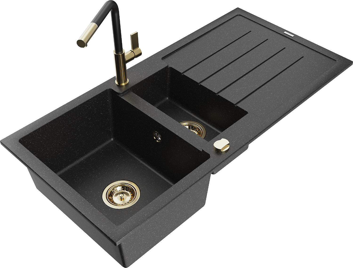 Mexen Andres žulový dřez 1,5-komorový s odkapávačem a kuchyňskou baterií Flora, černá/stříbrná - 6515-73-670401-57-G