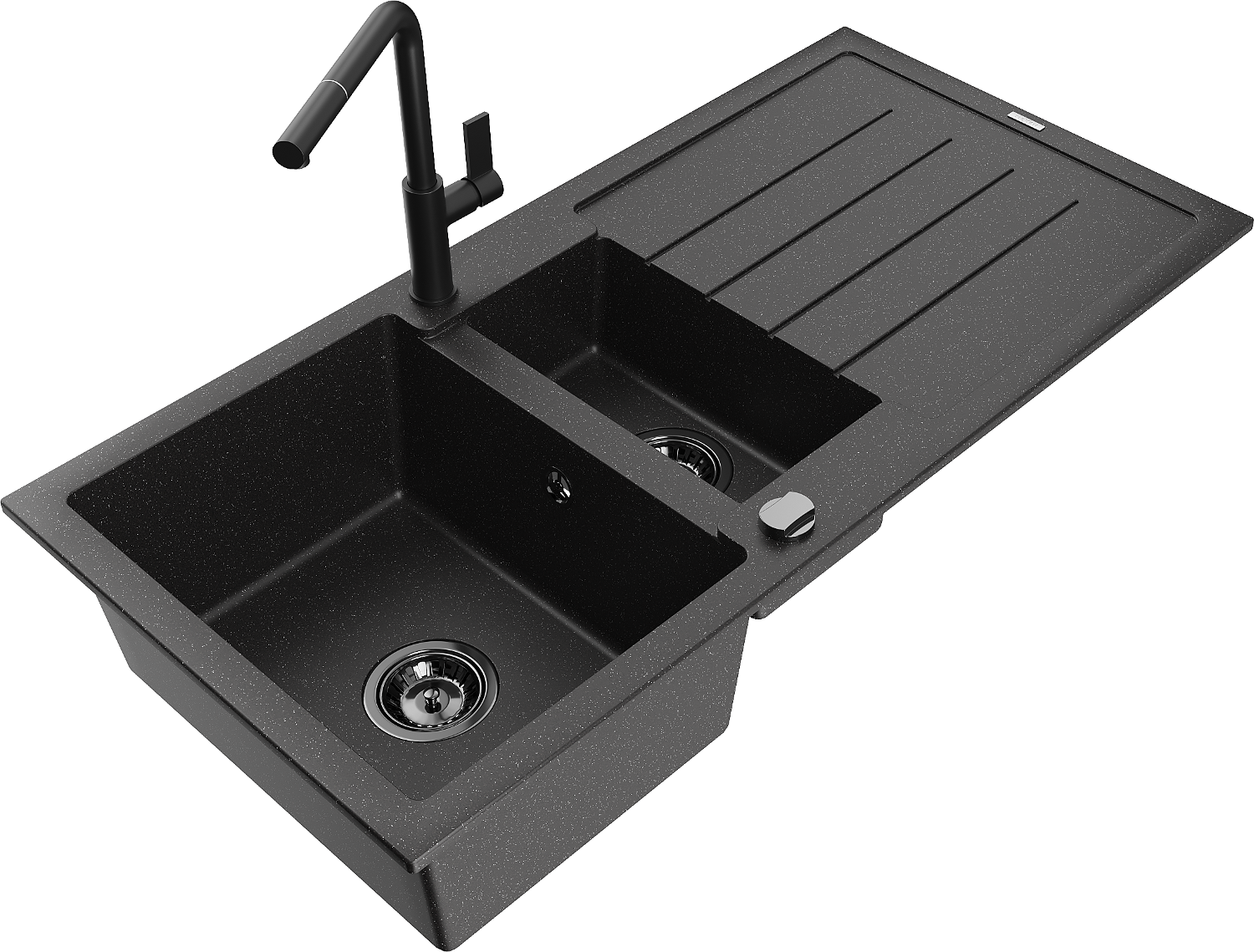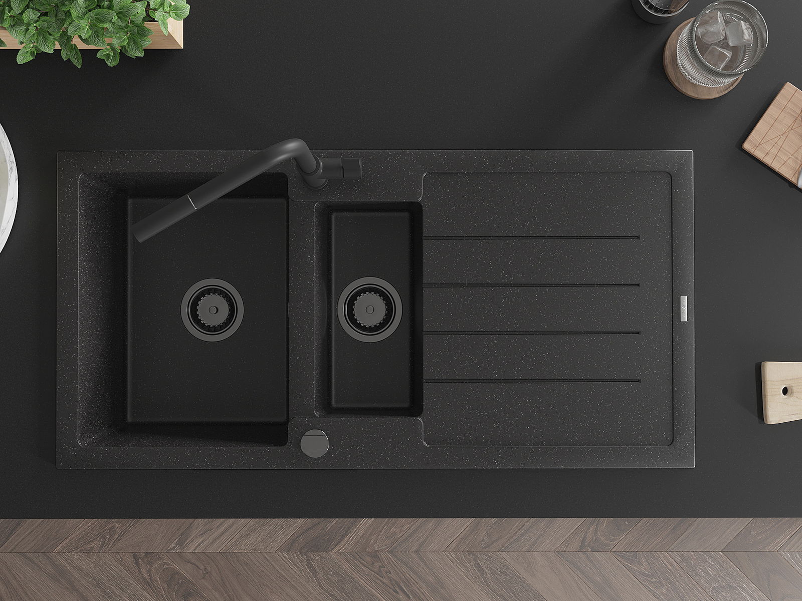 Mexen Andres granitový dřez 1,5-komorový s odkapávačem a kuchyňskou baterií Flora, černý/stříbrný - 6515-73-670401-70-B