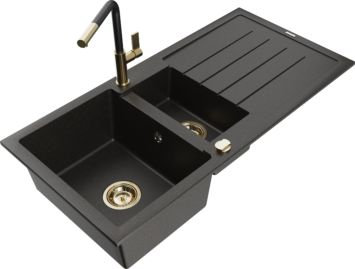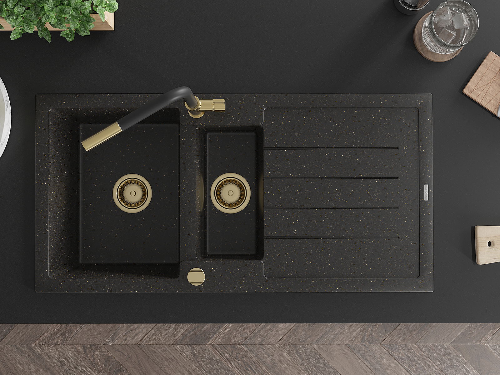 Mexen Andres žulový dřez 1,5-komorový s odkapávačem a kuchyňskou baterií Flora, černý/zlatý - 6515-75-670401-57-G