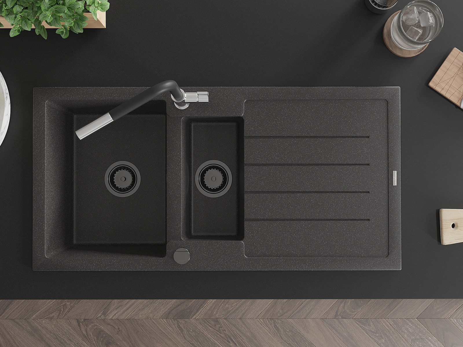 Mexen Andres granitový dřez 1,5 komorový s odkapávačem a kuchyňskou baterií Flora, černý s tečkami - 6515-76-670401-07-B