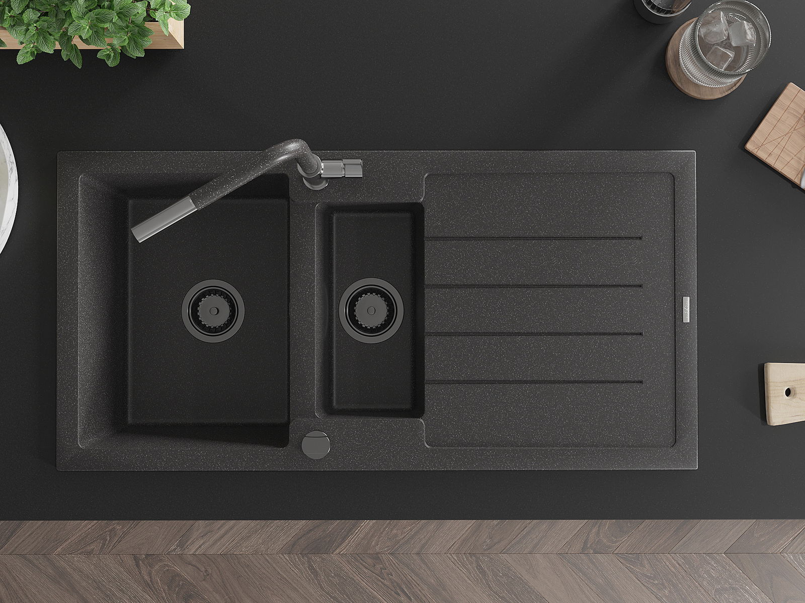 Mexen Andres granitový dřez 1,5-komorový s odkapávačem a kuchyňskou baterií Flora, černý stříkaný - 6515-76-670401-08-B