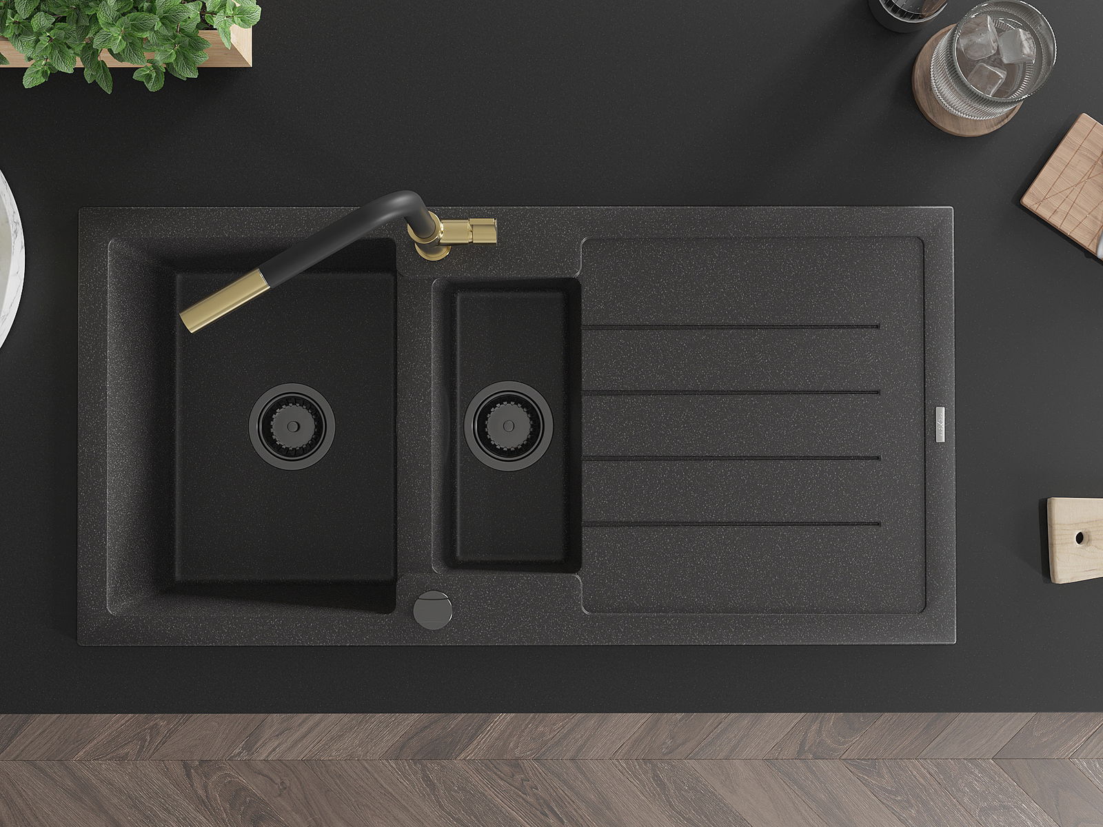Mexen Andres granitový dřez 1,5-komorový s odkapávačem a kuchyňskou baterií Flora, černý se skvrnami - 6515-76-670401-57-B
