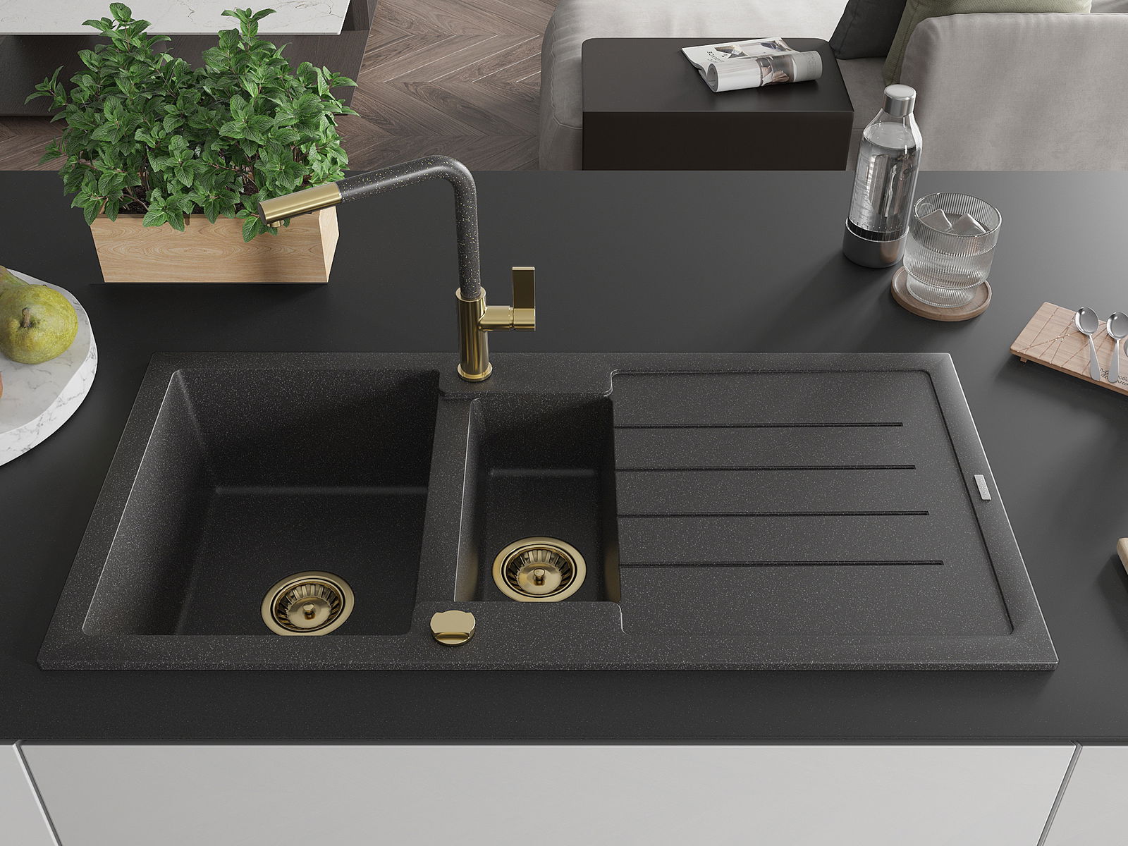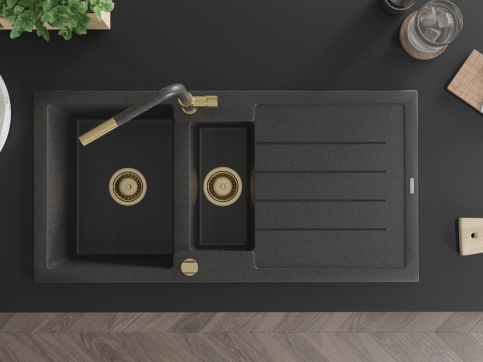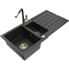 Mexen Andres granitový dřez 1,5-komorový s odkapávačem a kuchyňskou baterií Flora, černý s tečkami - 6515-76-670401-75-G