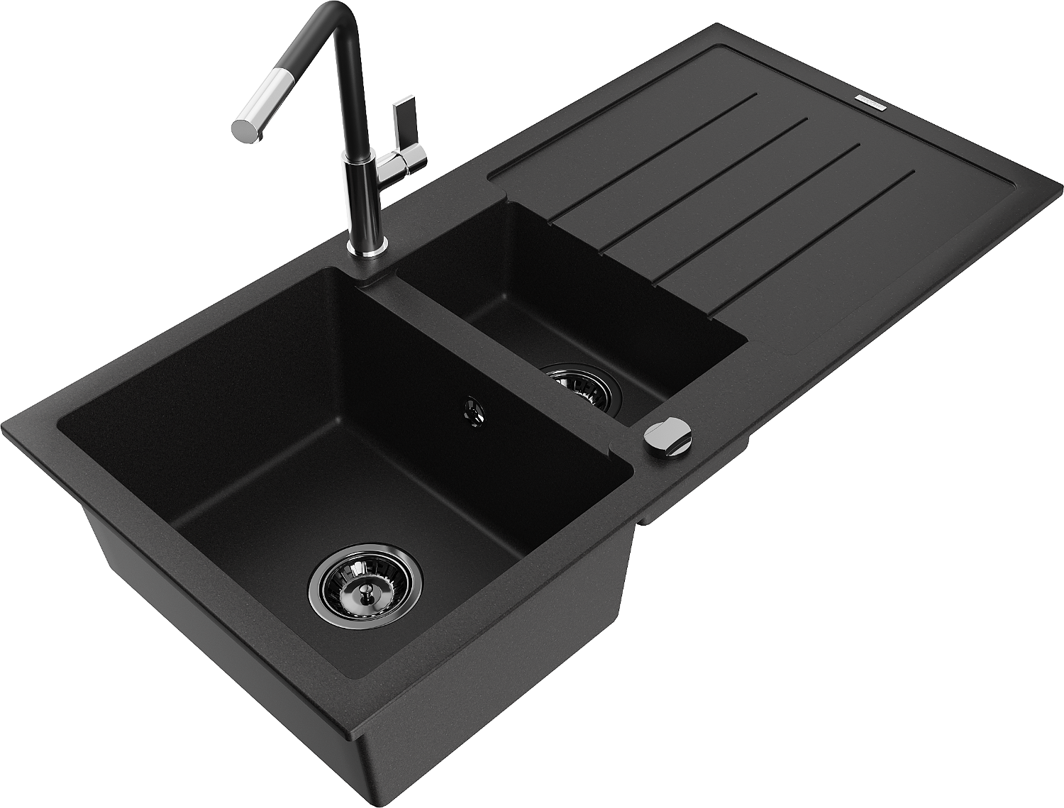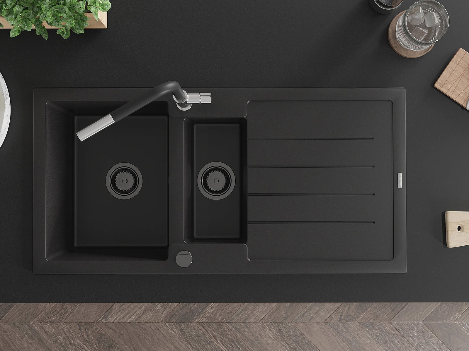 Mexen Andres granitový dřez 1,5-komorový s odkapávačem a kuchyňskou baterií Flora, černý - 6515-77-670401-07-B