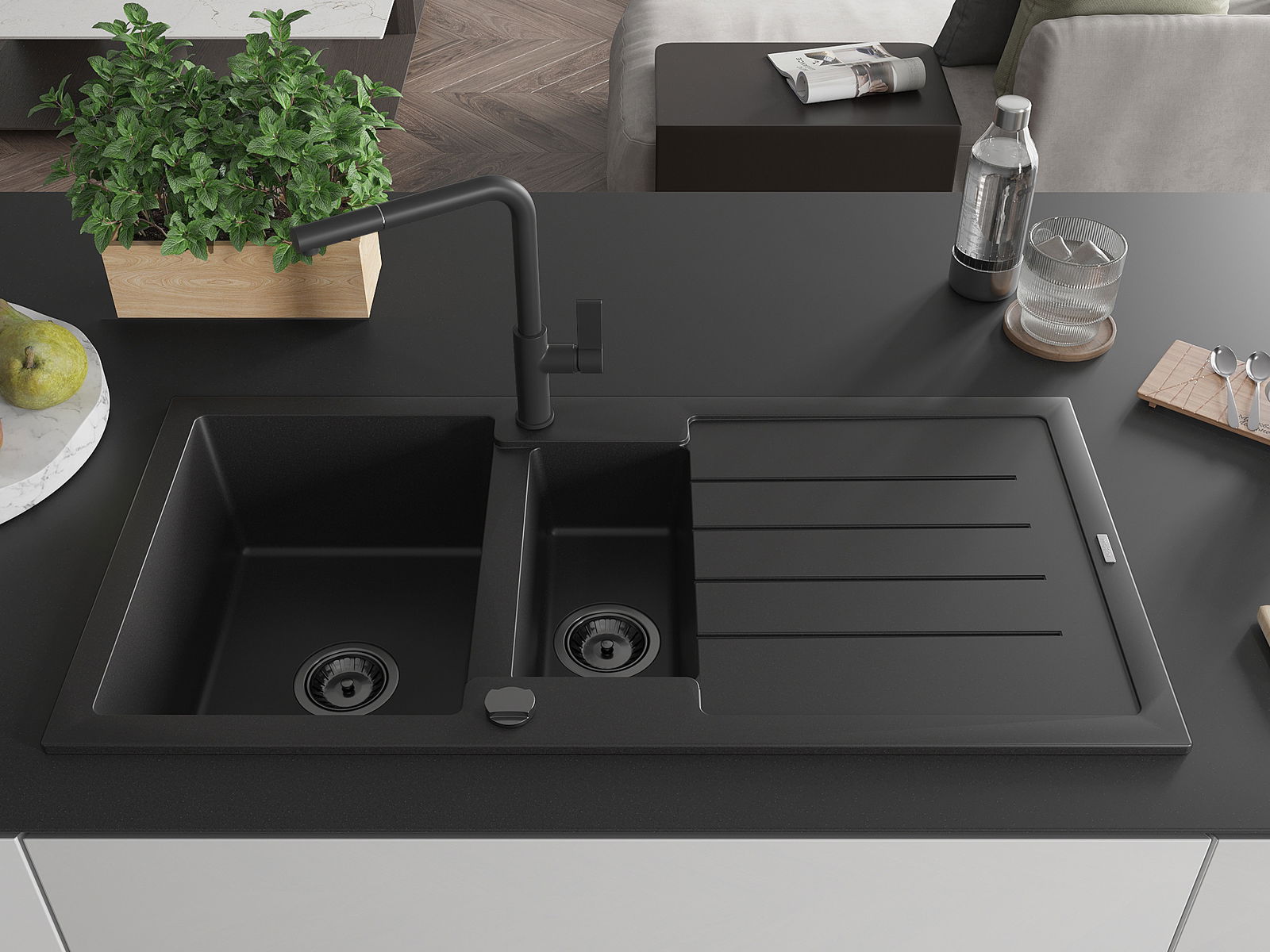 Mexen Andres žulový dřez 1,5-komorový s odkapávačem a kuchyňskou baterií Flora, černý - 6515-77-670401-70-B