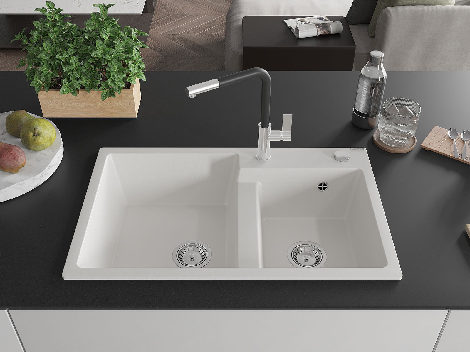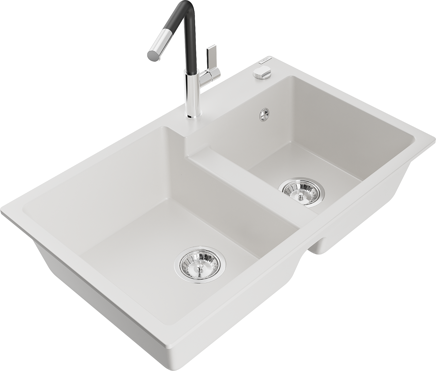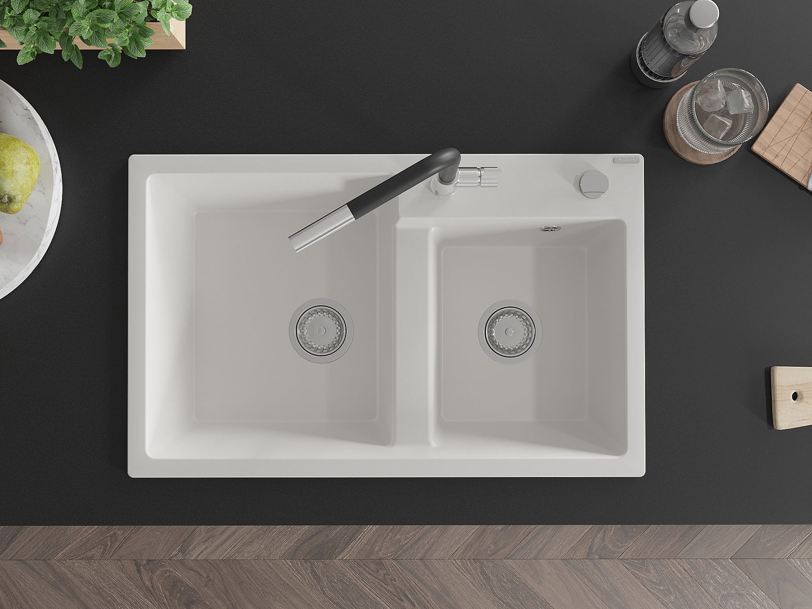 Mexen Tomas žulový dřez s 2 komorami a kuchyňskou baterií Flora, bílý - 6516-20-670401-07