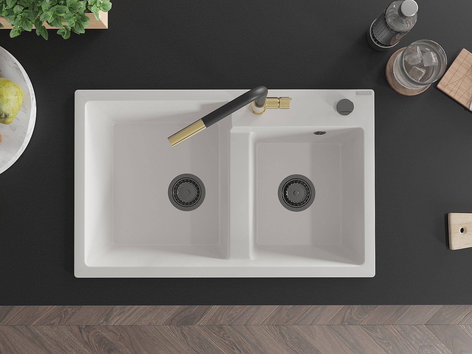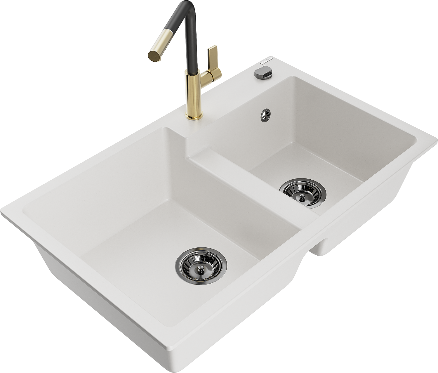 Mexen Tomas dvoukomorový žulový dřez s kuchyňskou baterií Flora, bílý - 6516-20-670401-57-B