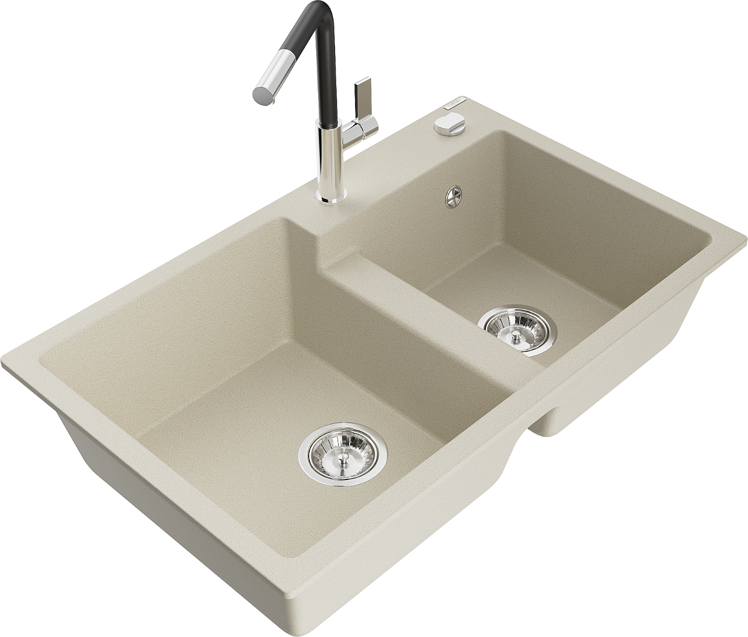 Mexen Tomas dřez granitový 2-komorový s kuchyňskou baterií Flora, béžový - 6516-69-670401-07