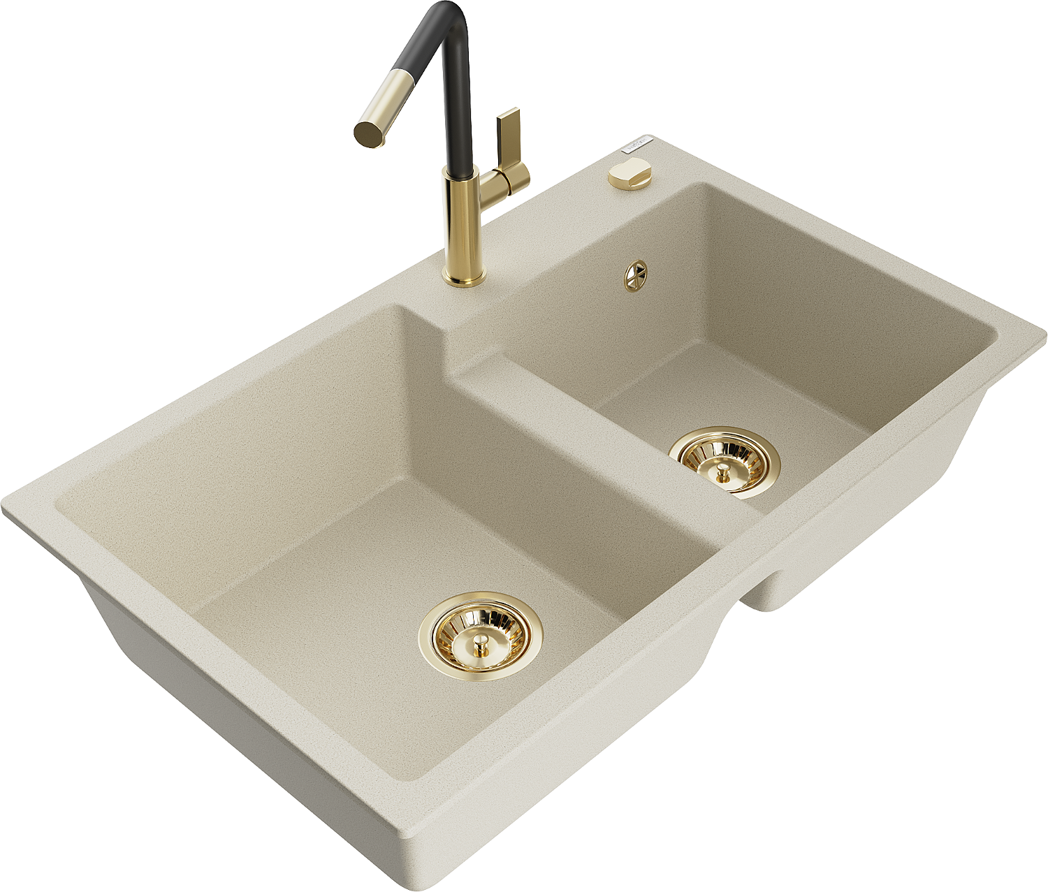 Mexen Tomas dřez žulový 2-komorový s kuchyňskou baterií Flora, béžový - 6516-69-670401-57-G