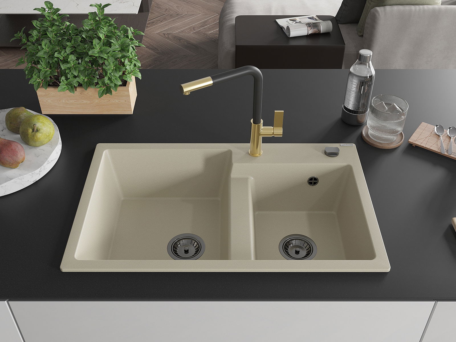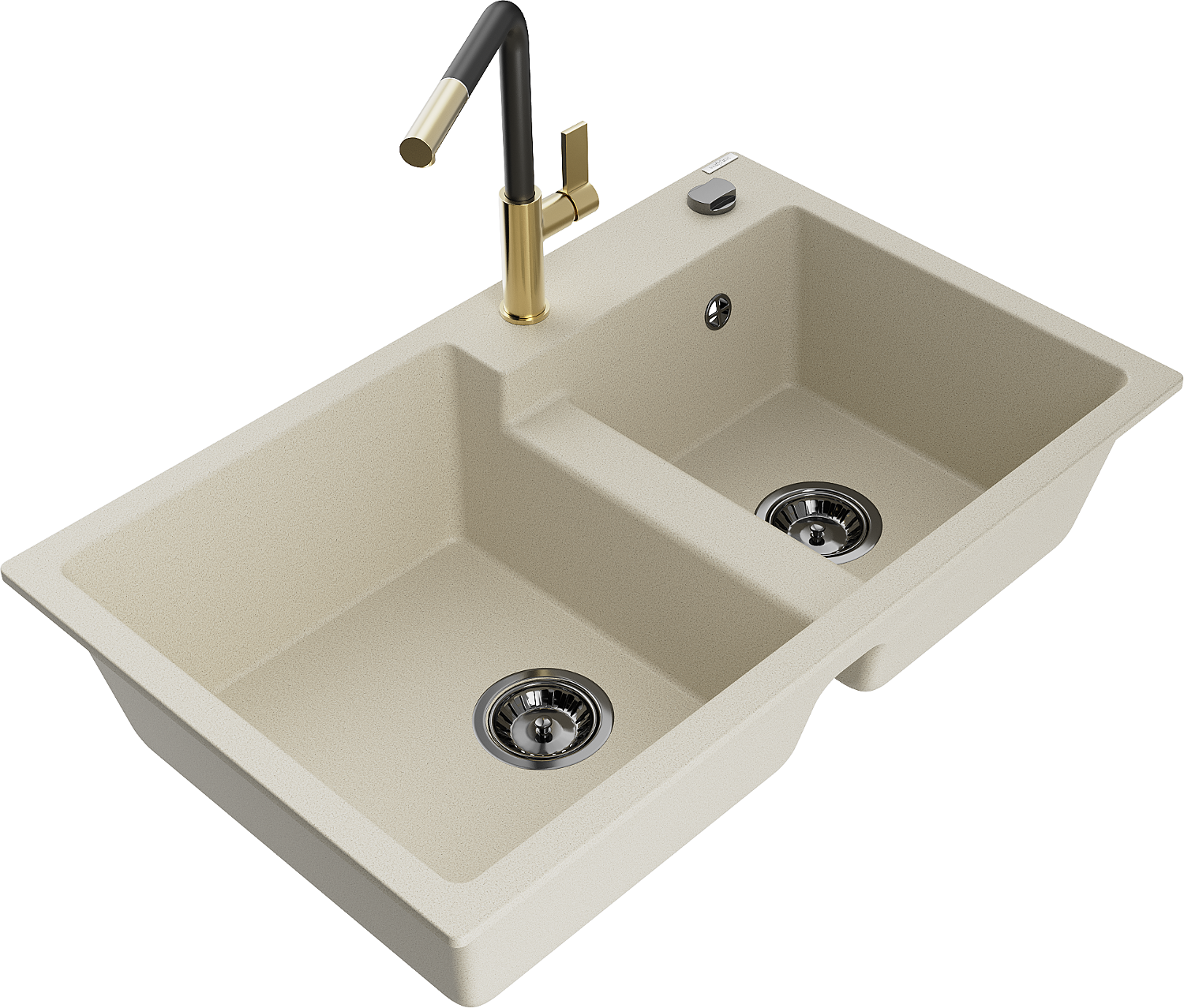 Mexen Tomas žulový dřez s 2 komorami a kuchyňskou baterií Flora, béžový - 6516-69-670401-57-B