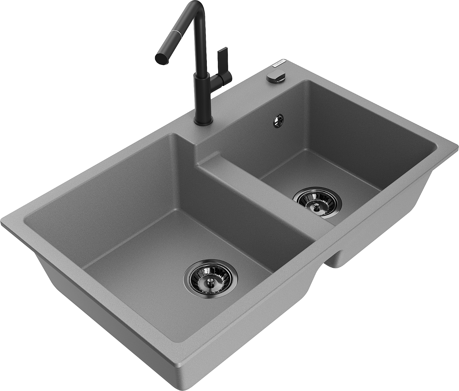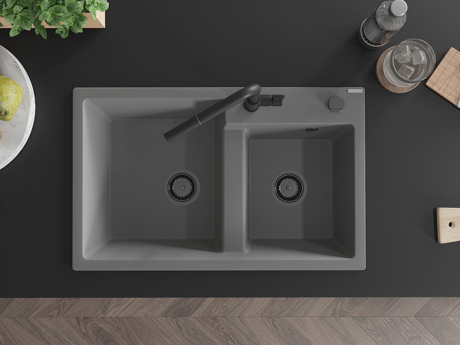 Mexen Tomas granitový dřez 2-komorový s kuchyňskou baterií Flora, šedý - 6516-71-670401-70-B