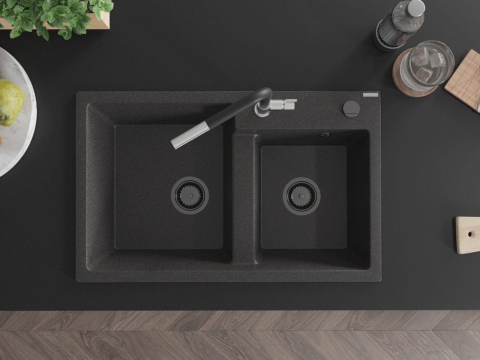 Mexen Tomas žulový dřez s 2 komorami a kuchyňskou baterií Flora, černý s tečkami - 6516-76-670401-07-B
