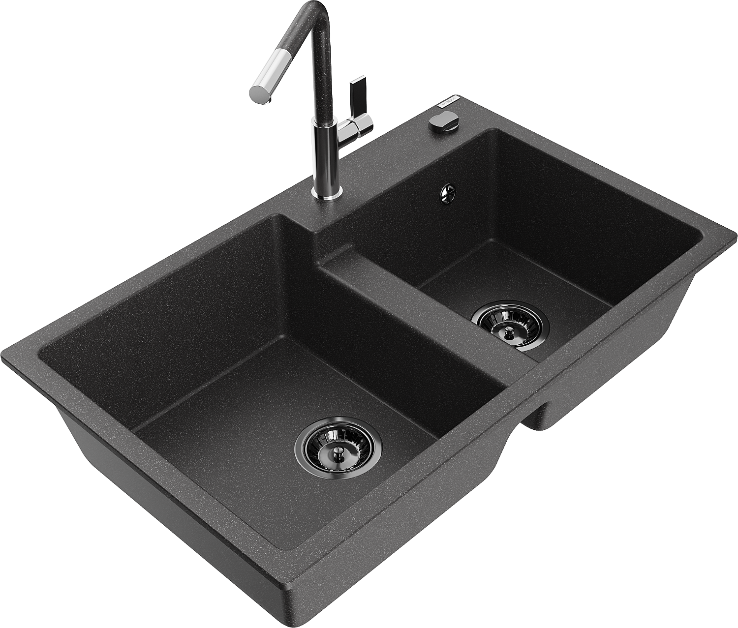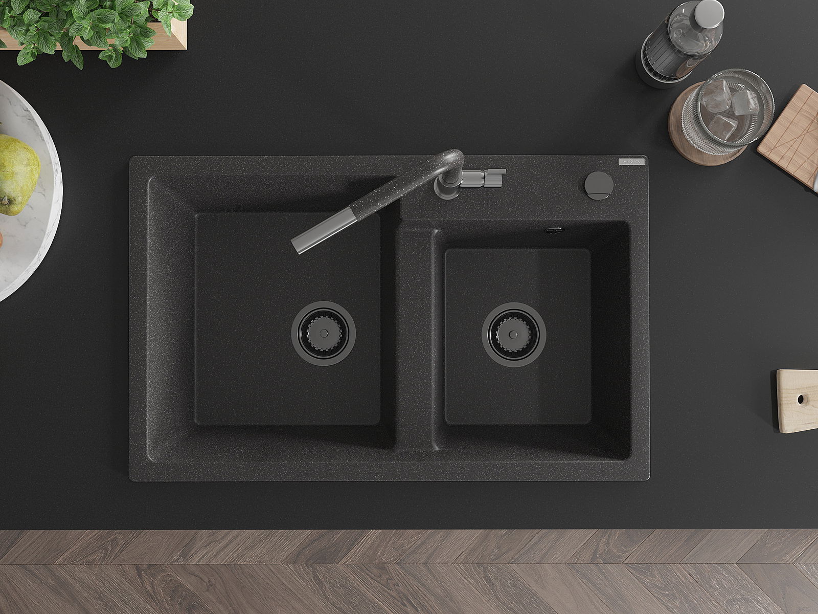 Mexen Tomas granitový dřez 2-komorový s kuchyňskou baterií Flora, černý skvrnitý - 6516-76-670401-08-B