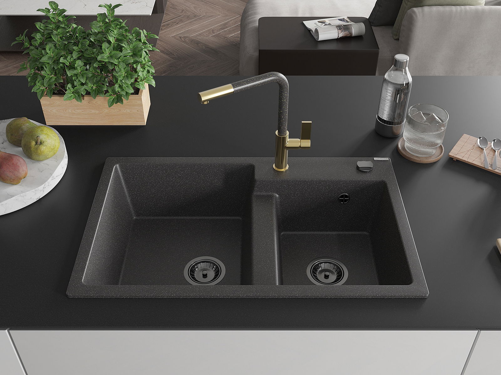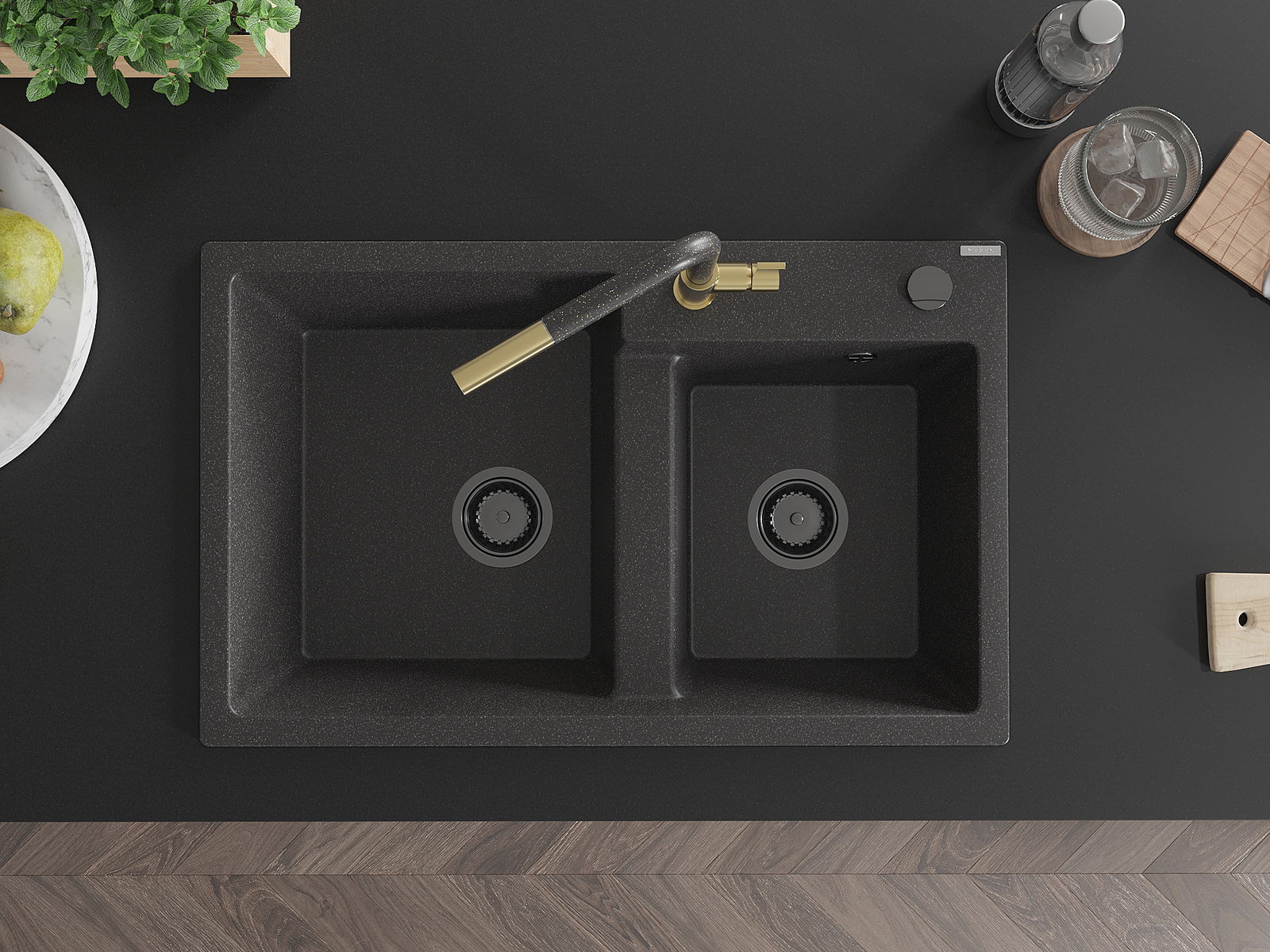 Mexen Tomas dřez granitový 2-komorový s kuchyňskou baterií Flora, černý tečkovaný - 6516-76-670401-75-B