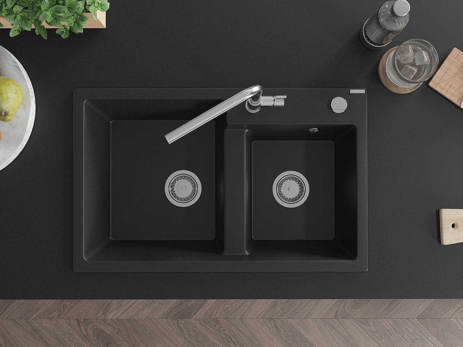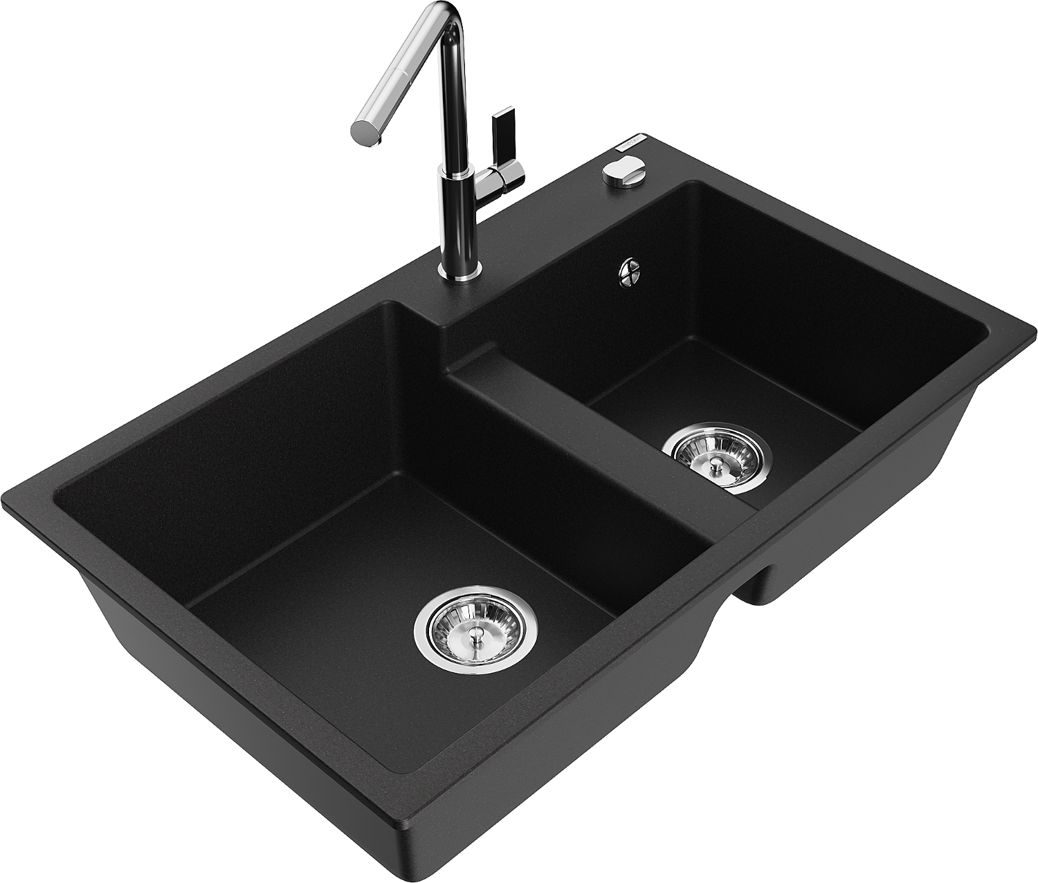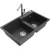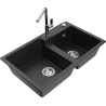 Mexen Tomas žulový dvoudřez s kuchyňskou baterií Flora, černý - 6516-77-670401-00