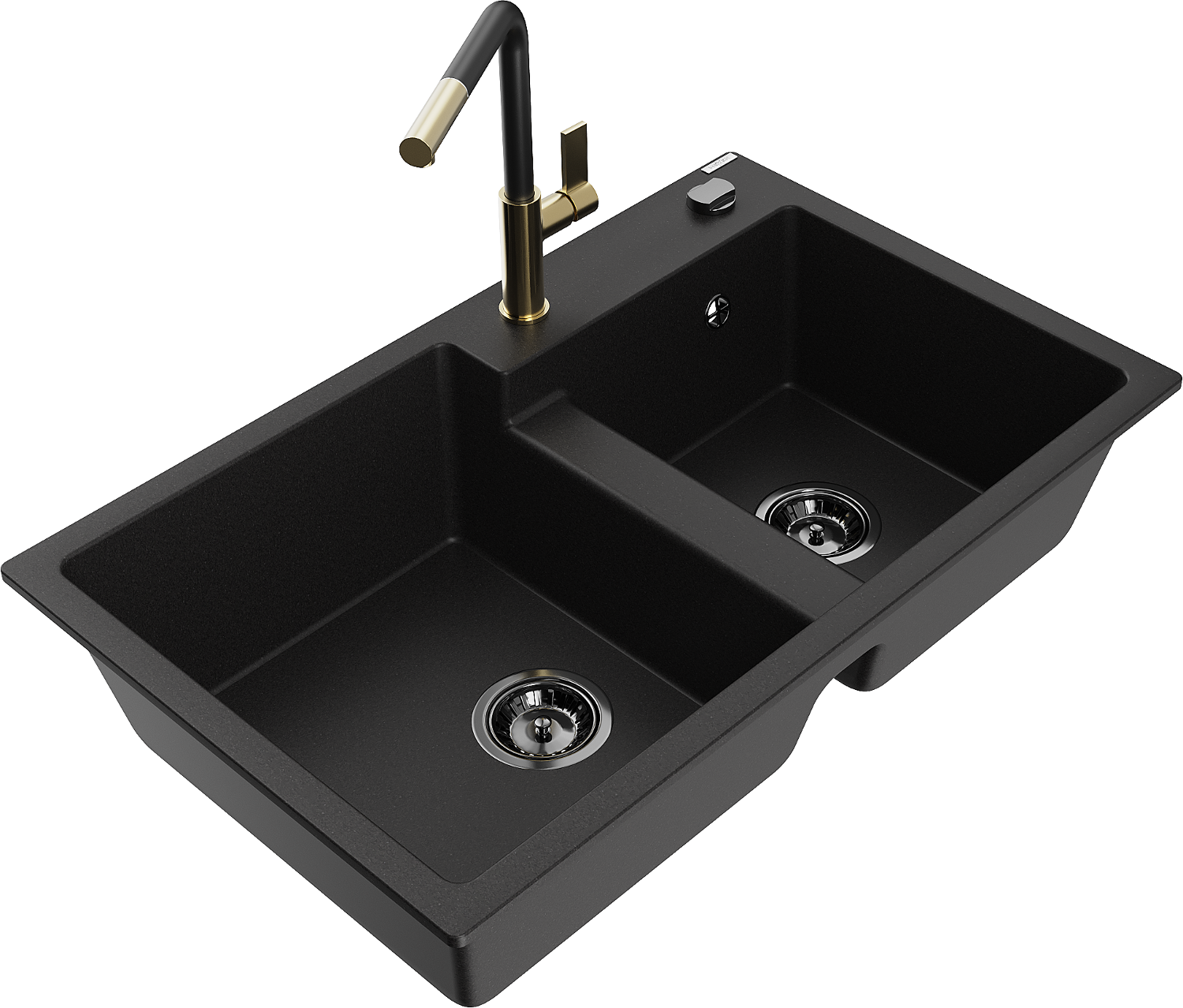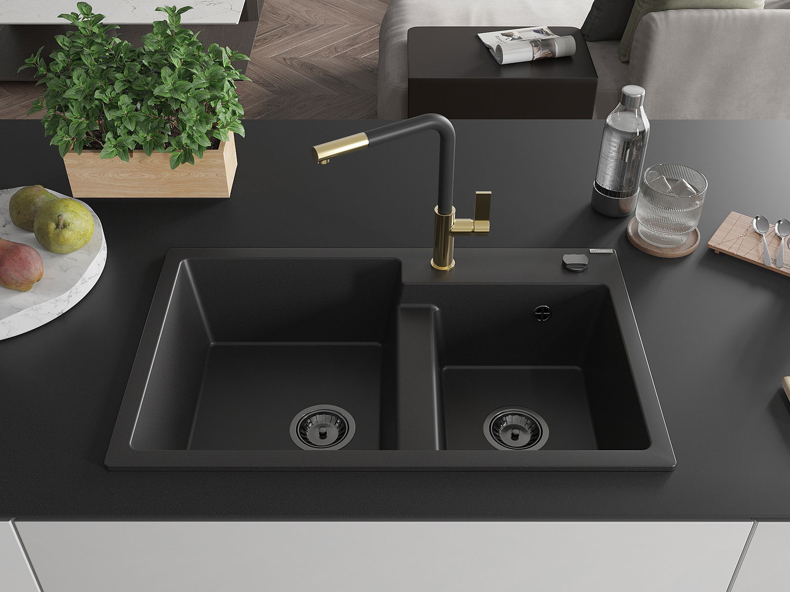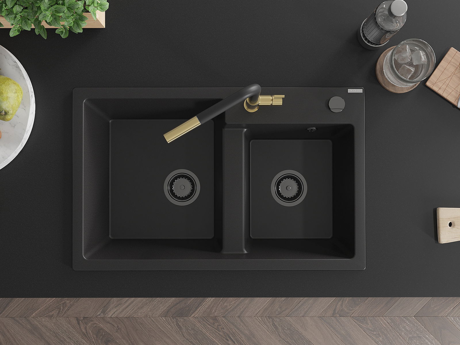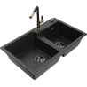 Mexen Tomas dřez granitový dvoukomorový s kuchyňskou baterií Flora, černý - 6516-77-670401-57-B