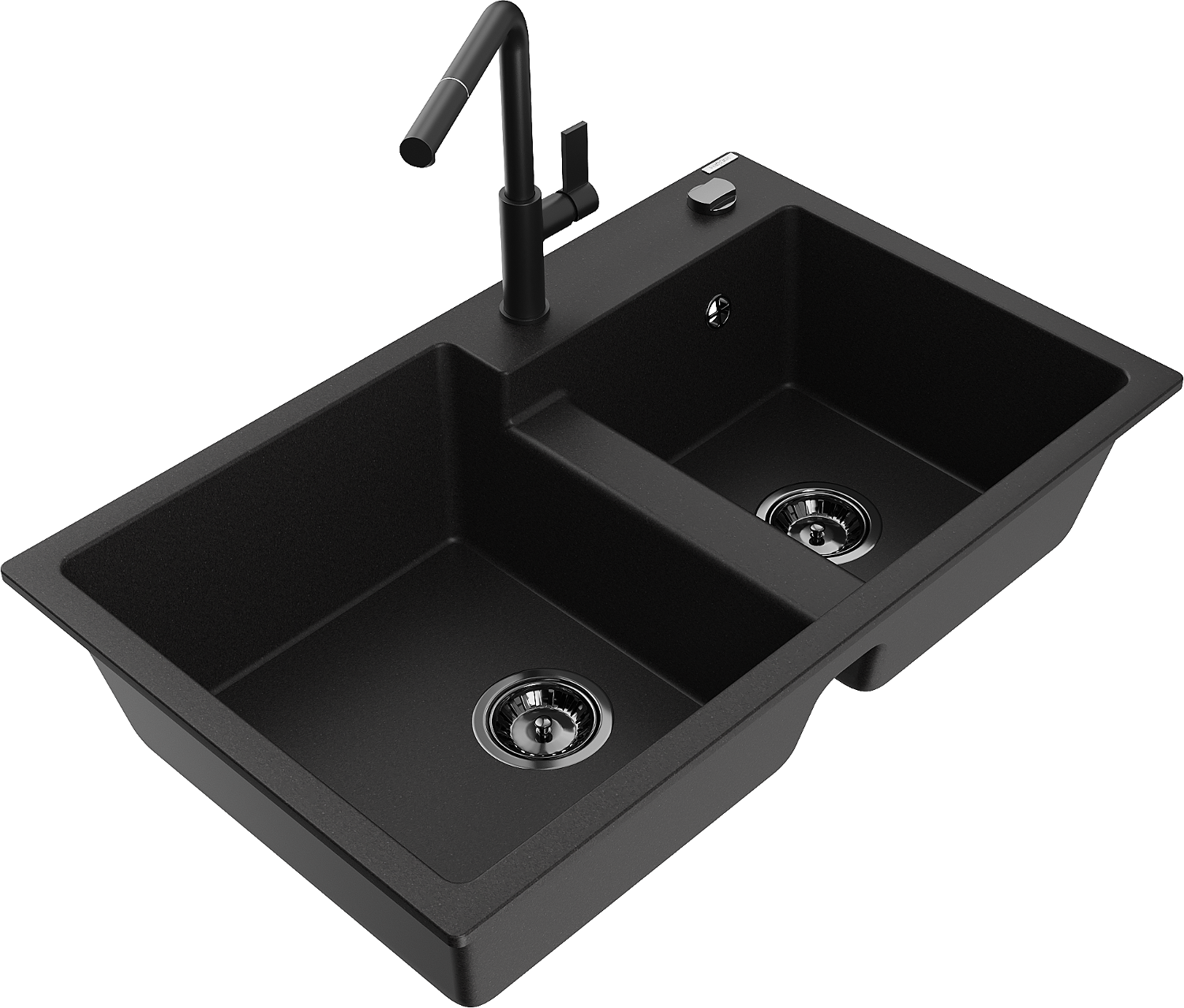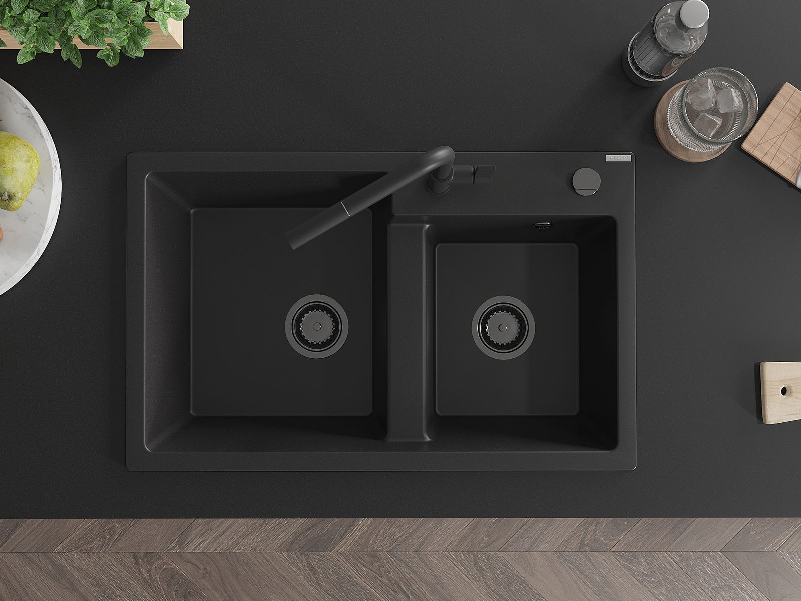 Mexen Tomas žulový dřez s 2 komorami a kuchyňskou baterií Flora, černý - 6516-77-670401-70-B