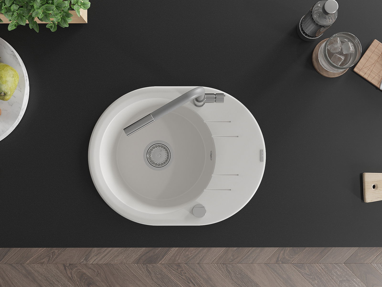 Povrch dřezu je odolný proti skvrnám a zabarvení, což usnadňuje jeho čištění a zachovává jeho barvu po dlouhou dobu používání. Estetický a praktický doplněk každé kuchyně.