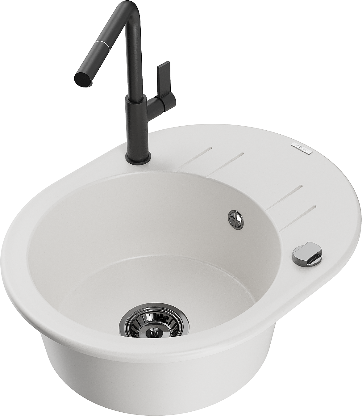 Mexen Kevin granitový dřez s 1 komorou, odkapávačem a kuchyňskou baterií Flora, bílý - 6517-20-670401-70-B