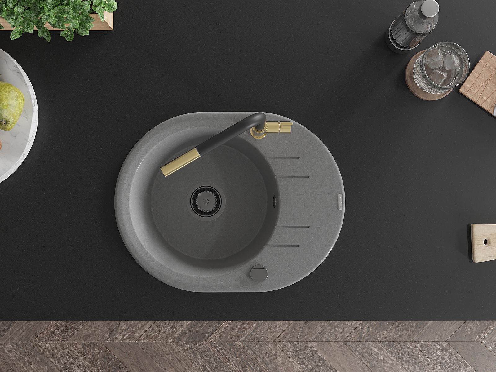• Mexen Kevin granitový dřez 1-komorový s odkapávačem a kuchyňskou baterií Flora, šedý - 6517-71-670401-57-B
