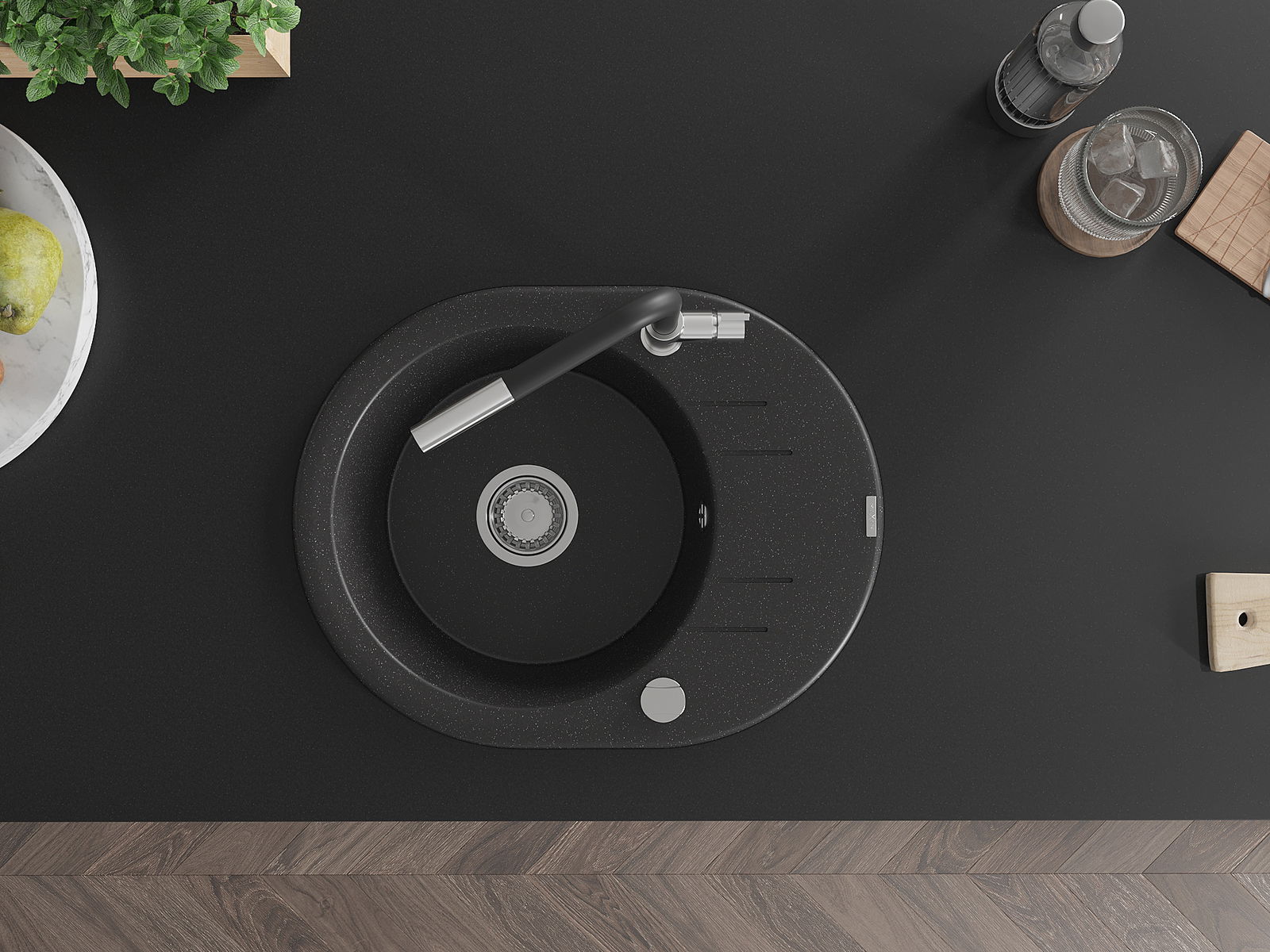 Mexen Kevin granitový dřez 1-komorový s odkapávačem a kuchyňskou baterií Flora, černý/stříbrný metalík - 6517-73-670401-07