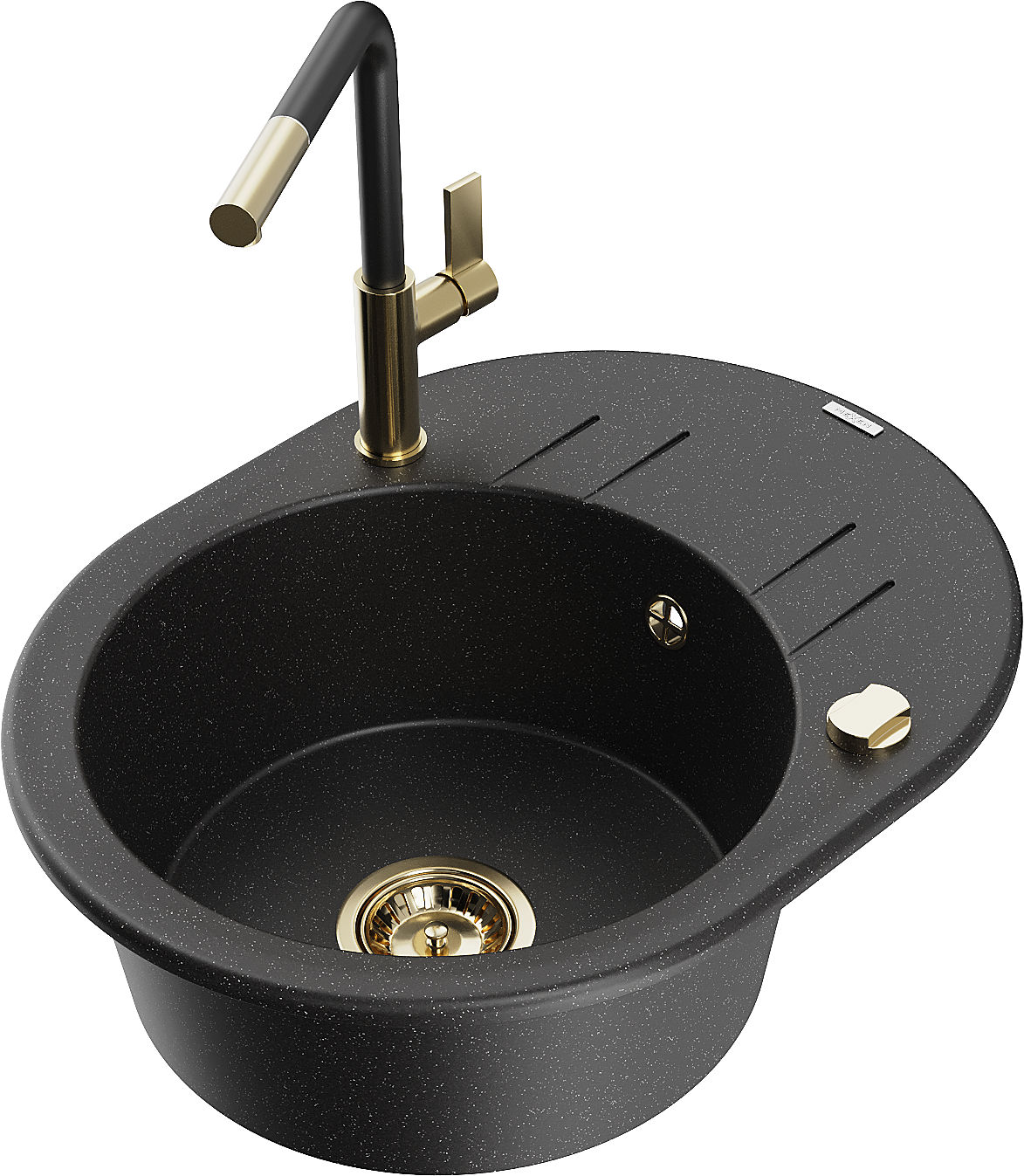 Mexen Kevin žulový jednodřez s odkapávačem a kuchyňskou baterií Flora, černý/stříbrný metalik - 6517-73-670401-57-G