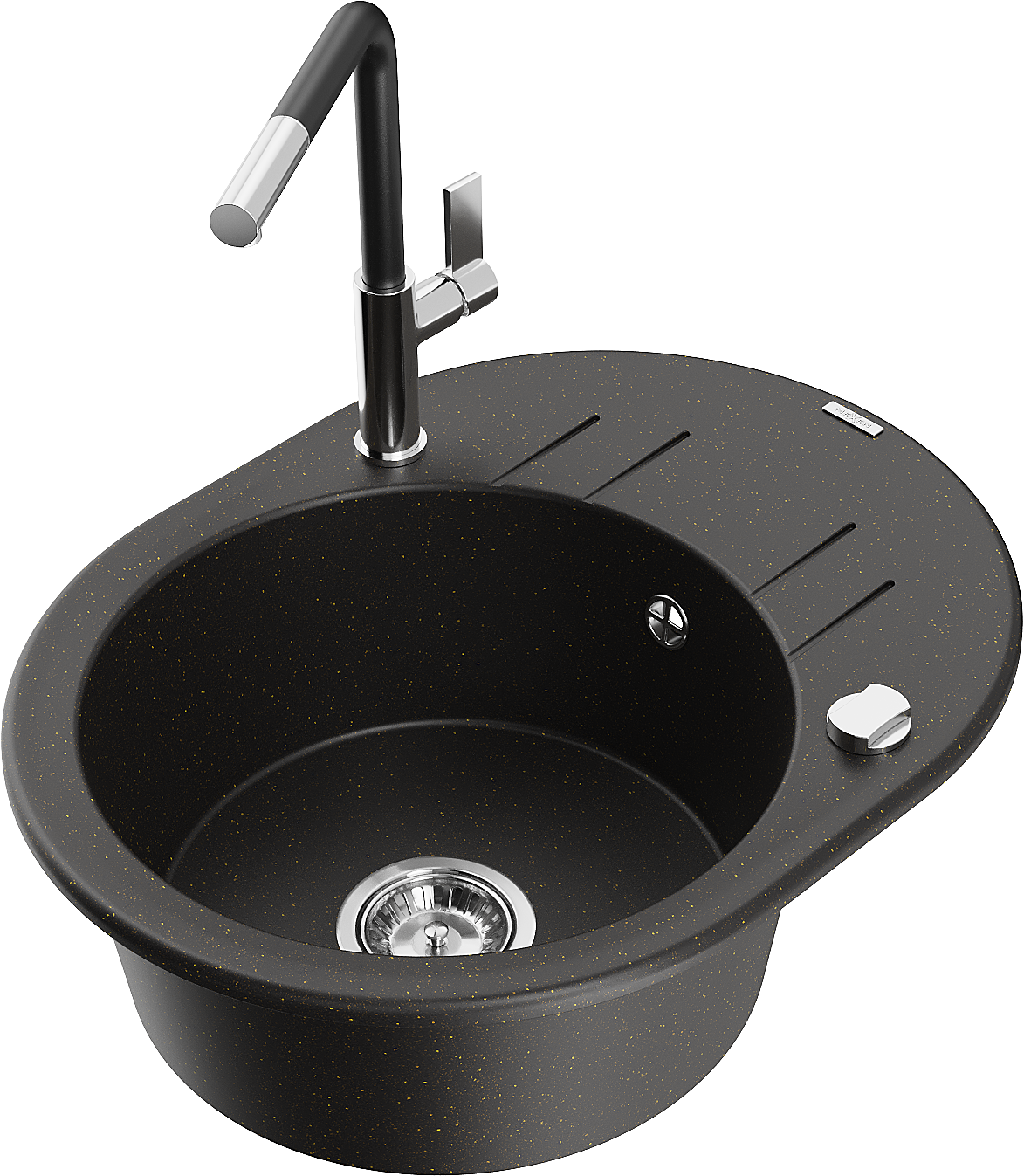 Mexen Kevin žulový dřez s 1 komorou a odkapávačem a kuchyňskou baterií Flora, černý/zlatý metalik - 6517-75-670401-07