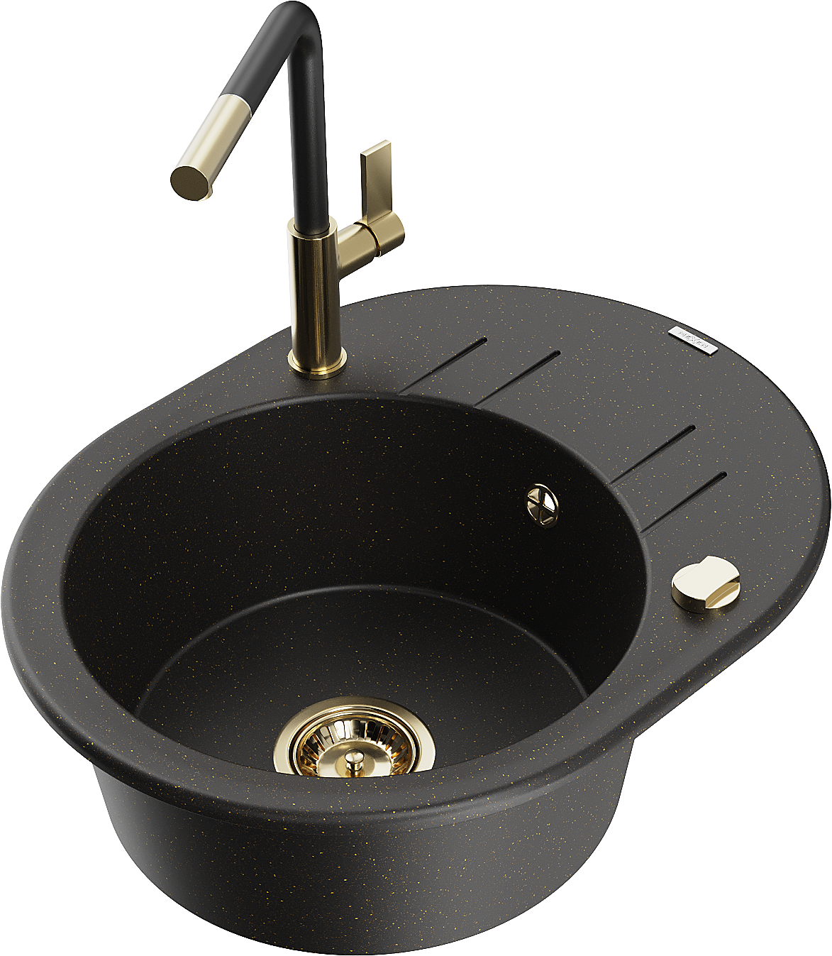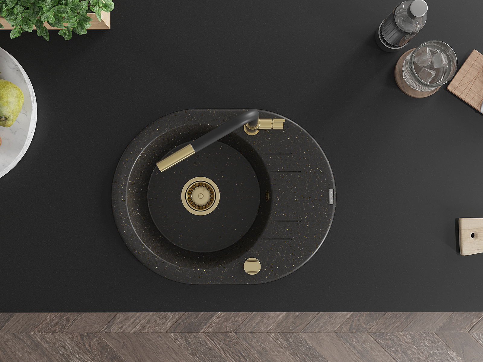 Mexen Kevin granitový dřez 1-komorový s odkapávačem a kuchyňskou baterií Flora, černý/zlatý metalik - 6517-75-670401-57-G