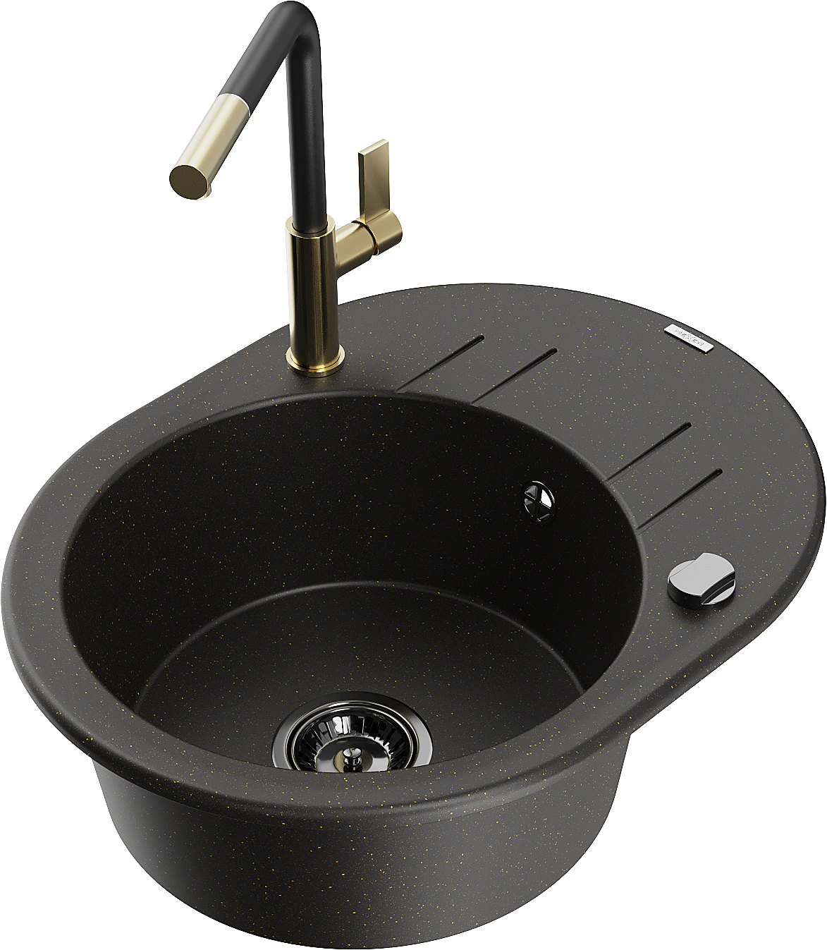 Mexen Kevin granitový dřez 1-komorový s odkapávačem a kuchyňskou baterií Flora, černý/zlatý metalík - 6517-75-670401-57-B