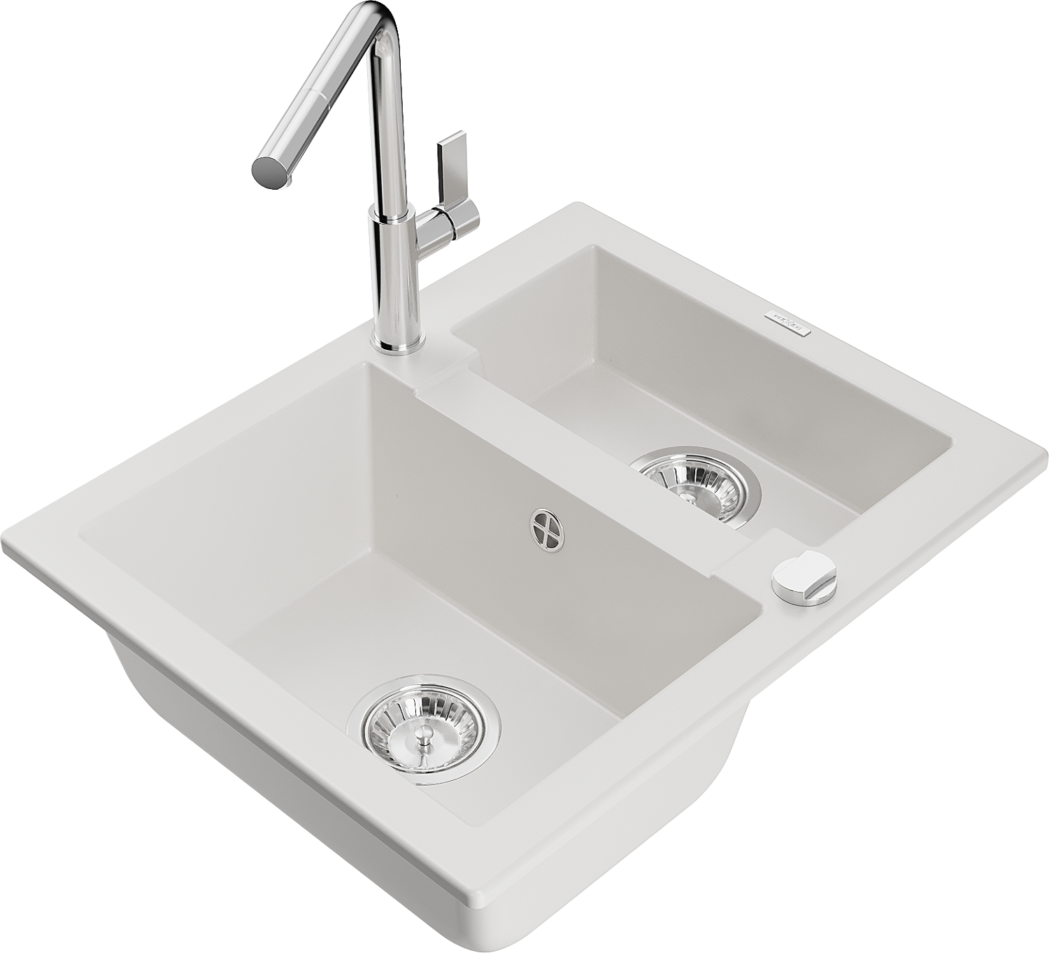 Mexen Carlos granitový dřez 1,5-komorový s kuchyňskou baterií Flora, bílý - 6518-20-670401-00