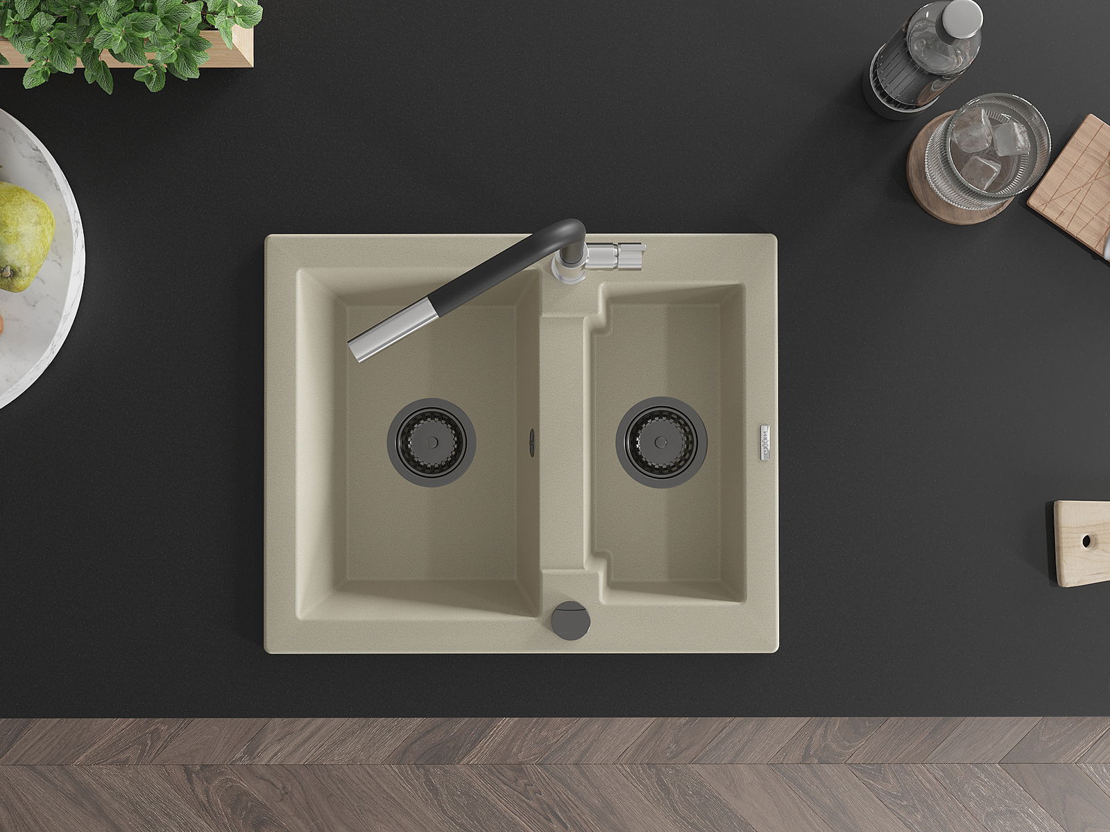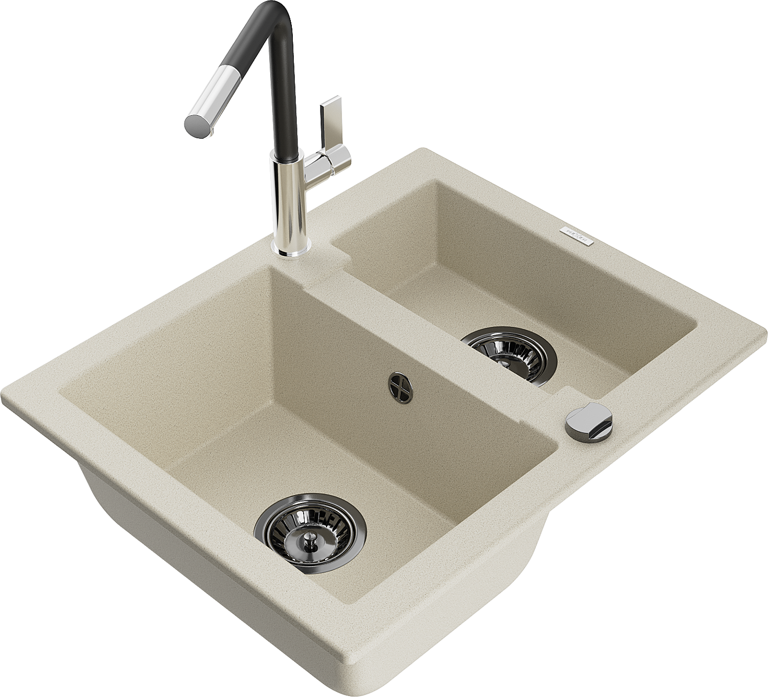 Mexen Carlos žulový dřez 1,5-komorový s kuchyňskou baterií Flora, béžový - 6518-69-670401-07-B