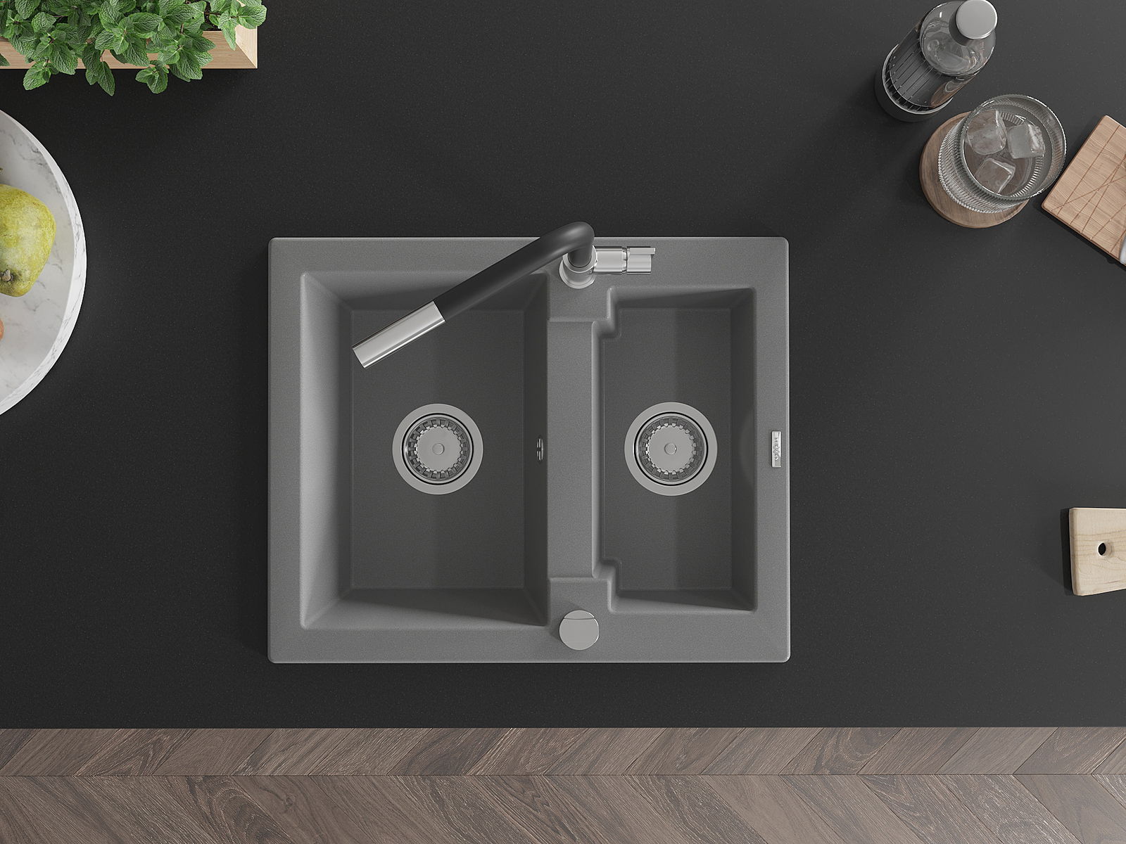 Mexen Carlos granitový dřez 1,5-komorový s kuchyňskou baterií Flora, šedý - 6518-71-670401-07