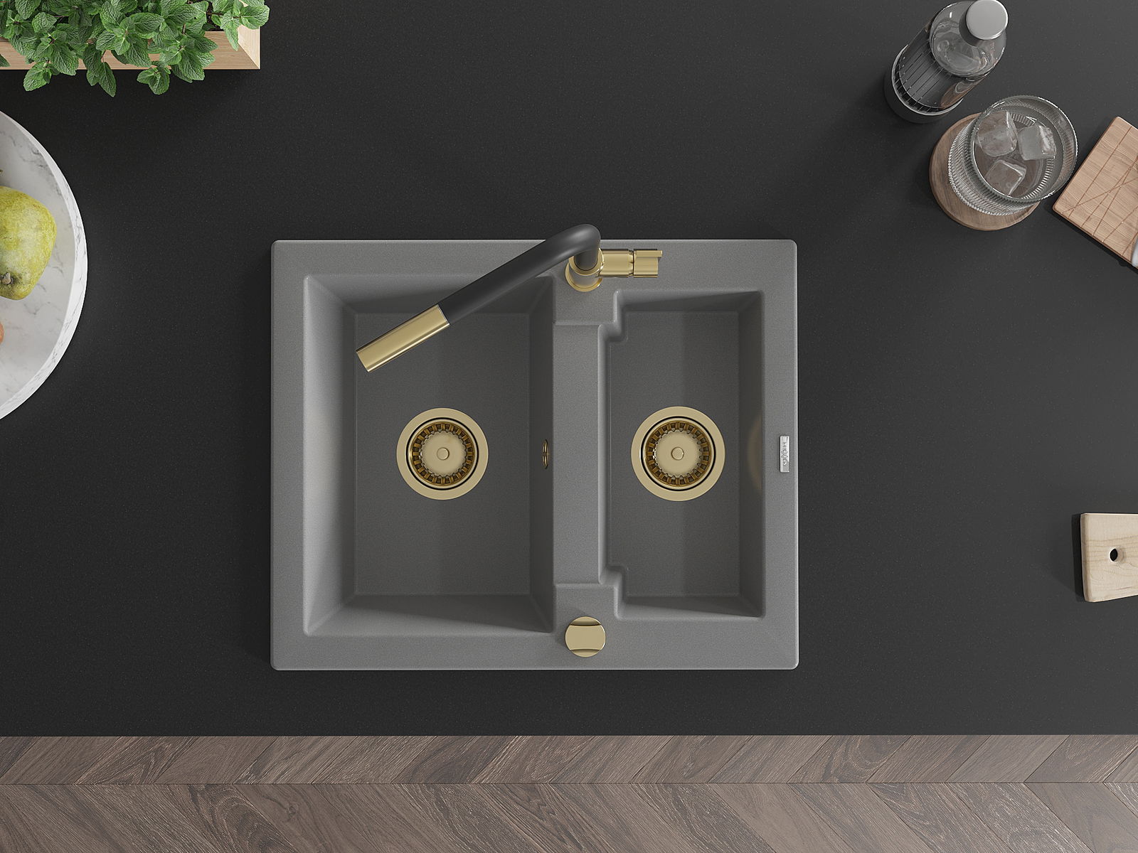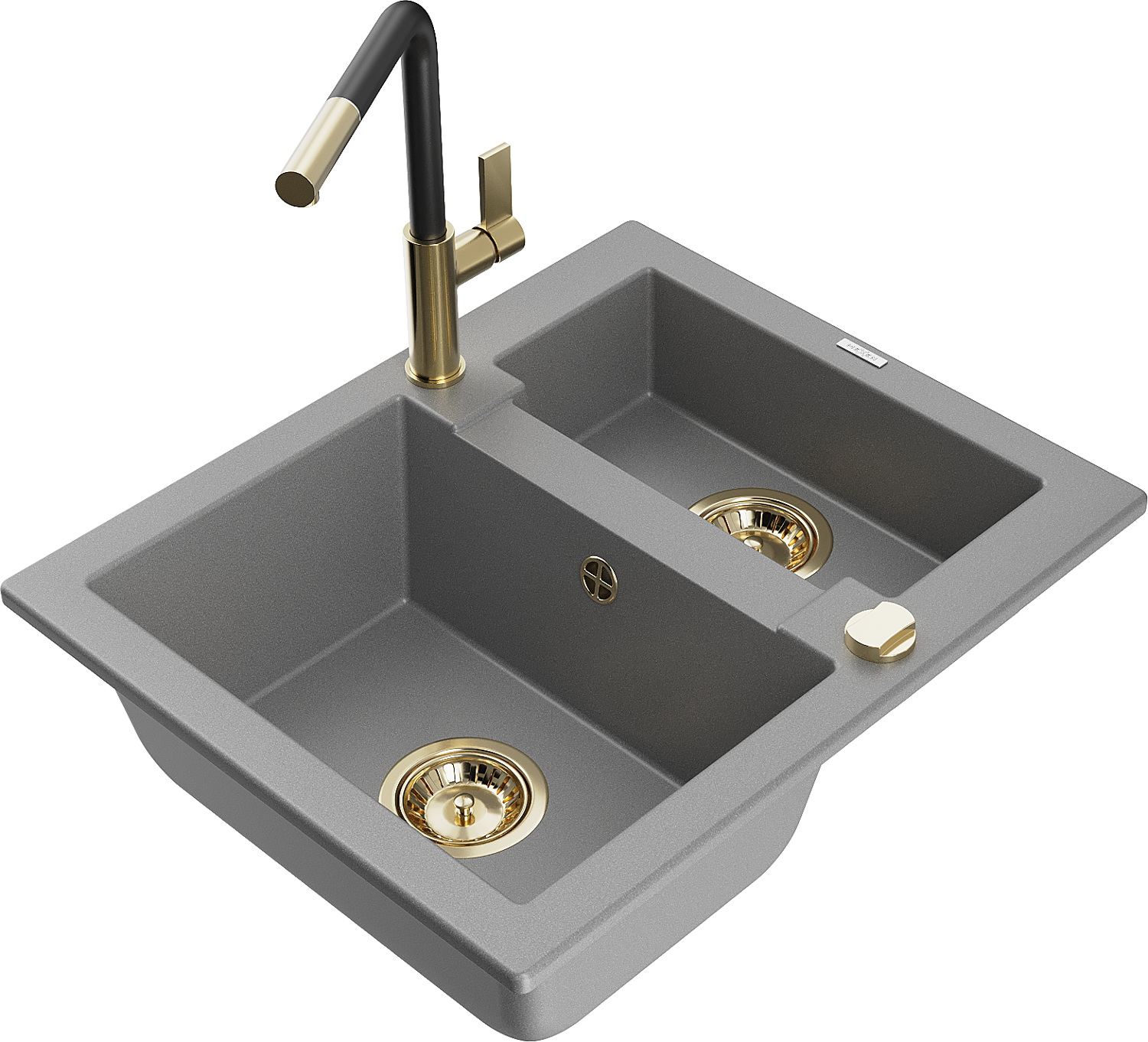 Mexen Carlos žulový dřez 1,5komorový s kuchyňskou baterií Flora, šedý - 6518-71-670401-57-G
