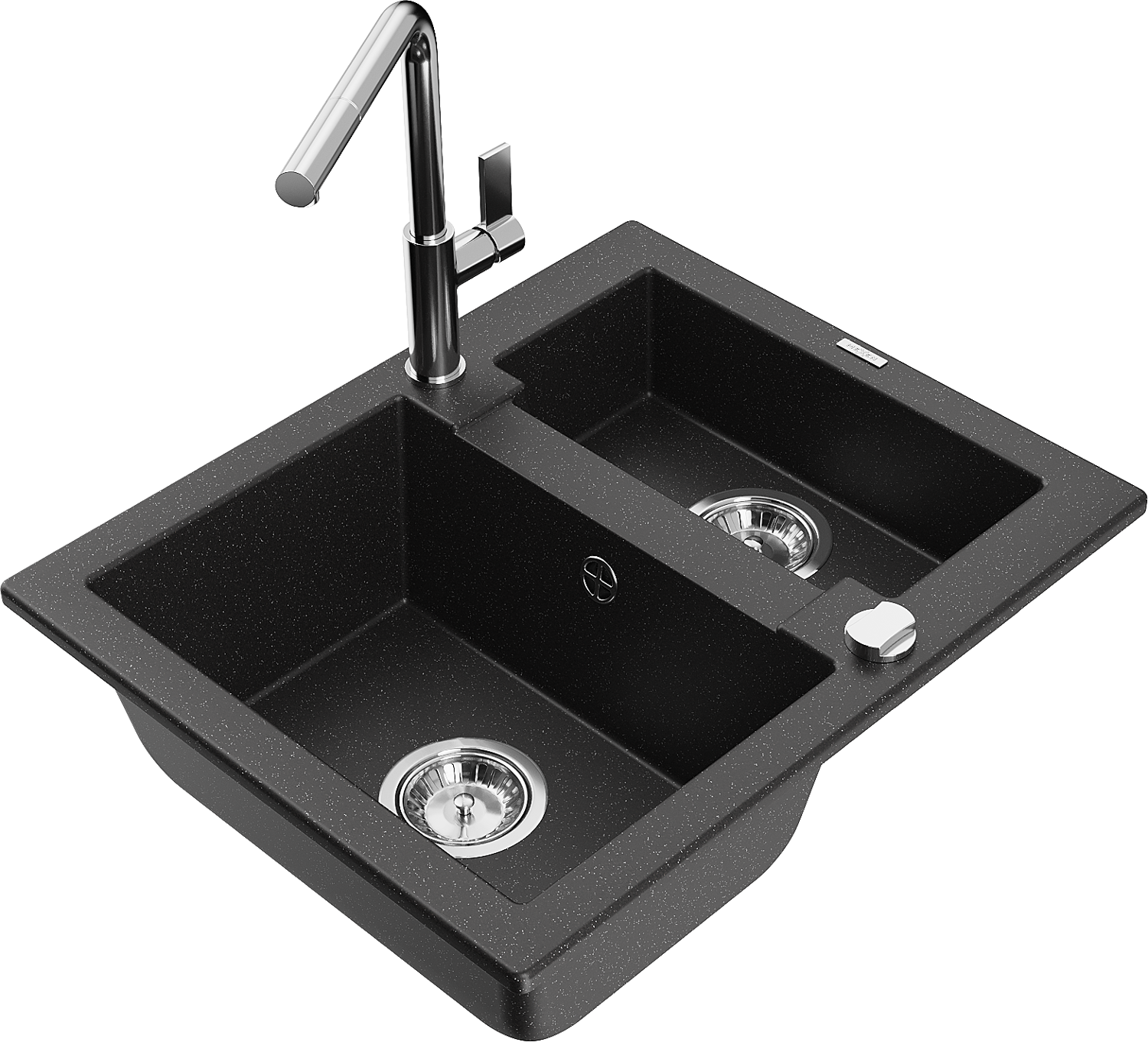 Mexen Carlos granitový dřez 1,5-komorový s kuchyňskou baterií Flora, černý/stříbrný metalik - 6518-73-670401-00