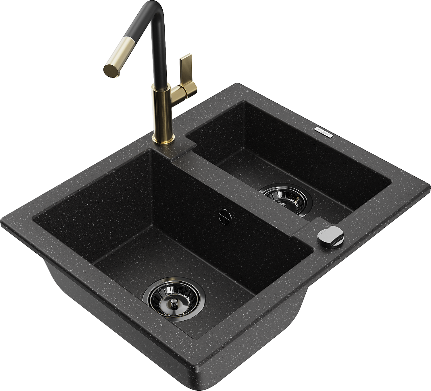 Mexen Carlos granitový dřez 1,5-komorový s kuchyňskou baterií Flora, černý/stříbrný metalik - 6518-73-670401-57-B