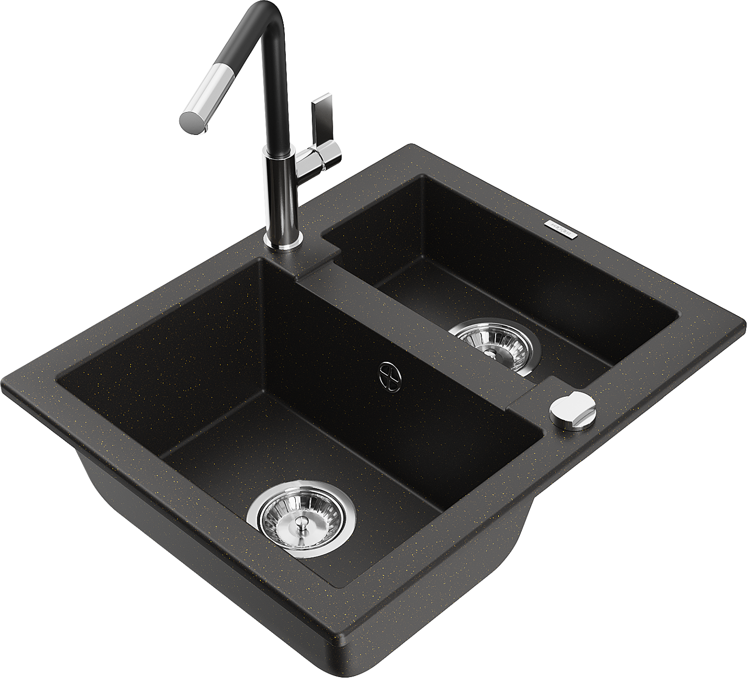 Mexen Carlos žulový dřez 1,5-komorový s kuchyňskou baterií Flora, černý/zlatý metalik - 6518-75-670401-07